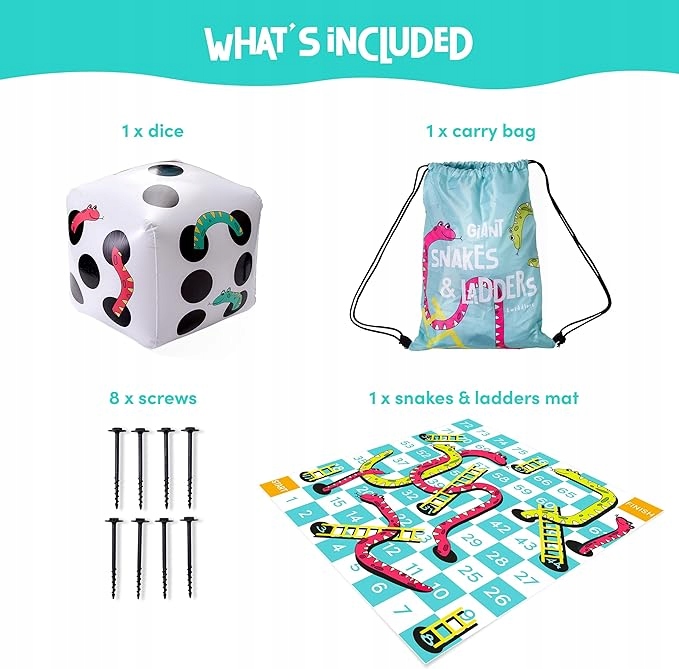 Мгновенная установка, бесконечное удовольствие: нашу игру «Змеи и гигантские лестницы» легко собрать. Просто раскатайте ковер и прикрепите его с помощью прилагаемых напольных колышков, надуйте кубики, и вы готовы к игре! Бросьте кости и посмотрите, куда вас приведет удача — игра настолько велика, что фишки — это вы!
