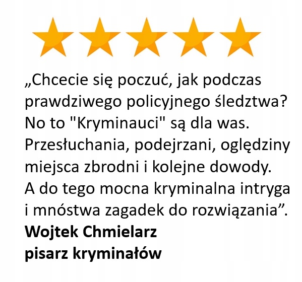 КРИМИНАУЦИ® — это криминальная история, радиоспектакль и интерактивная игра для вечеринок в коробке б>. Задача, полная вопросов и сомнений, ожидающих прояснения. Это захватывающая история прямо из самых продаваемых криминальных романов. В отличие от книги или подкаста, игроки могут почувствовать себя настоящими детективами — они являются активными участниками расследования и оказывают реальное влияние на ход расследования.