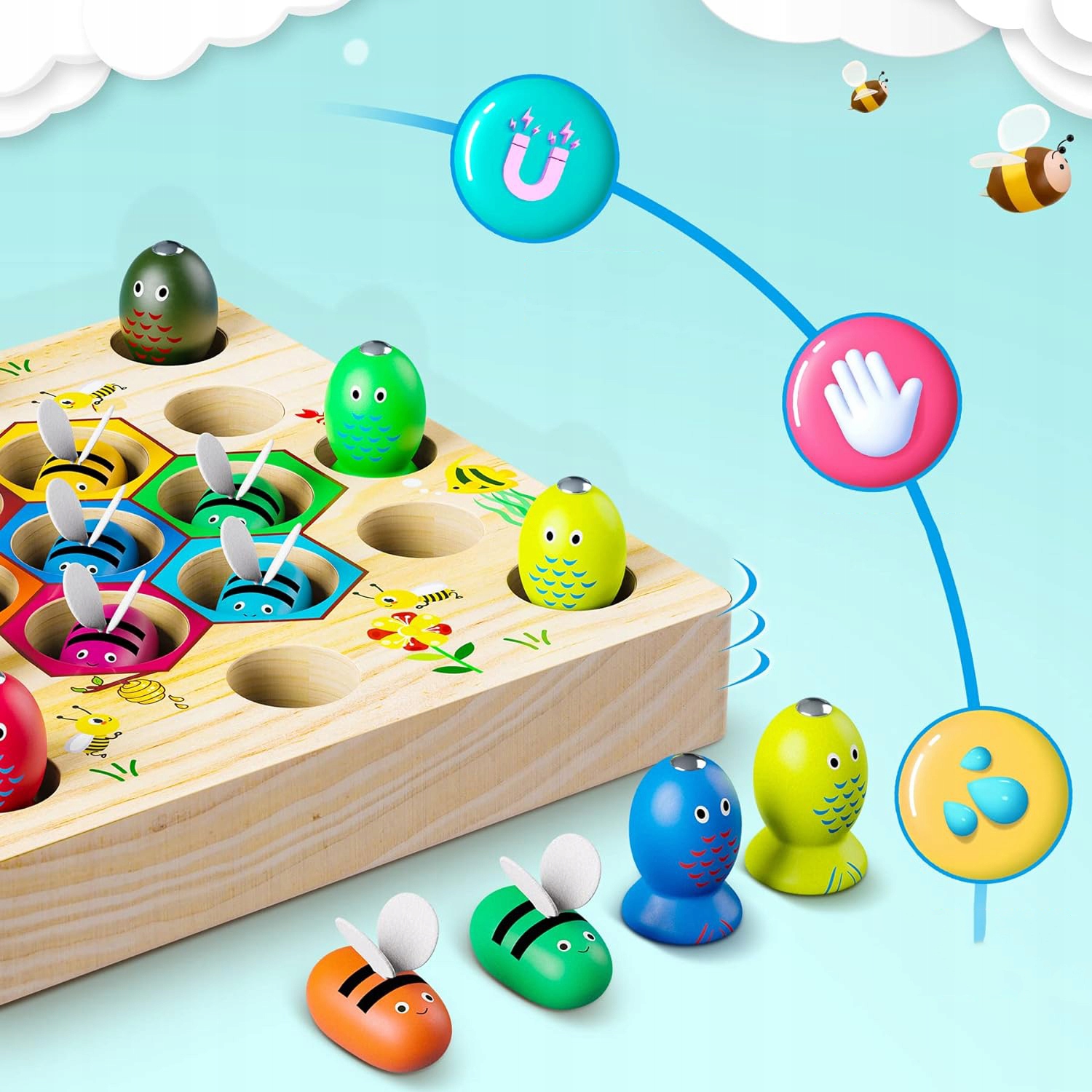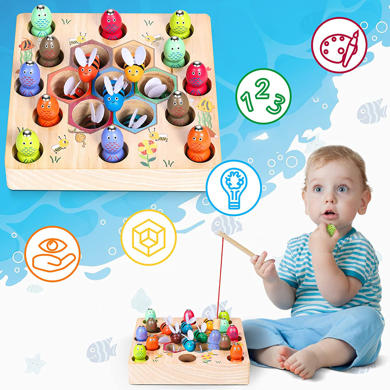 🐝 🐝 [Рыбалка в Деревянных играх выстраивает мост общения между родителями и детьми]. Они создают тесное взаимодействие и общение. Взаимодействуя с деревянной игрой-рыбалкой, родители не пропустят ни одного этапа развития своего ребенка.
