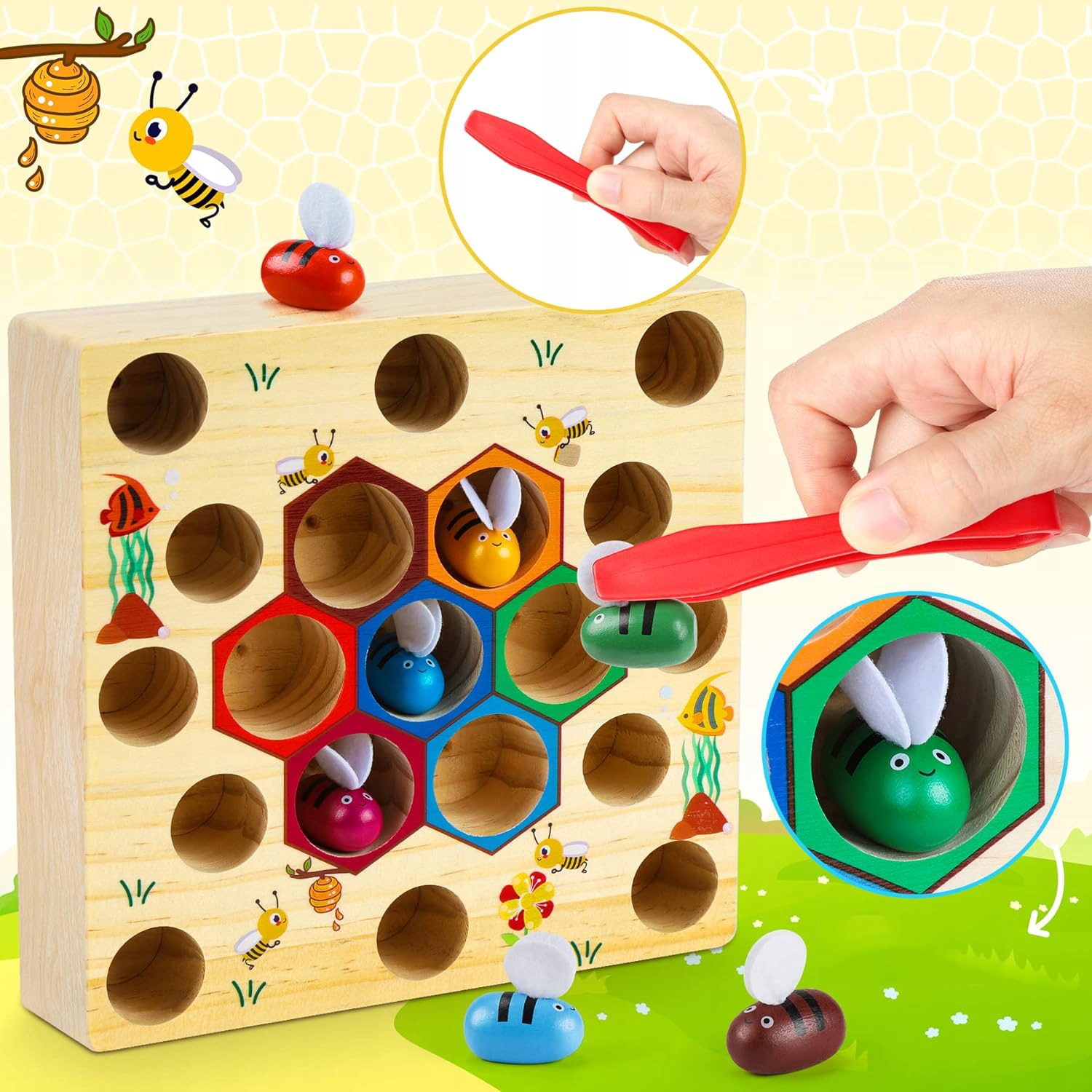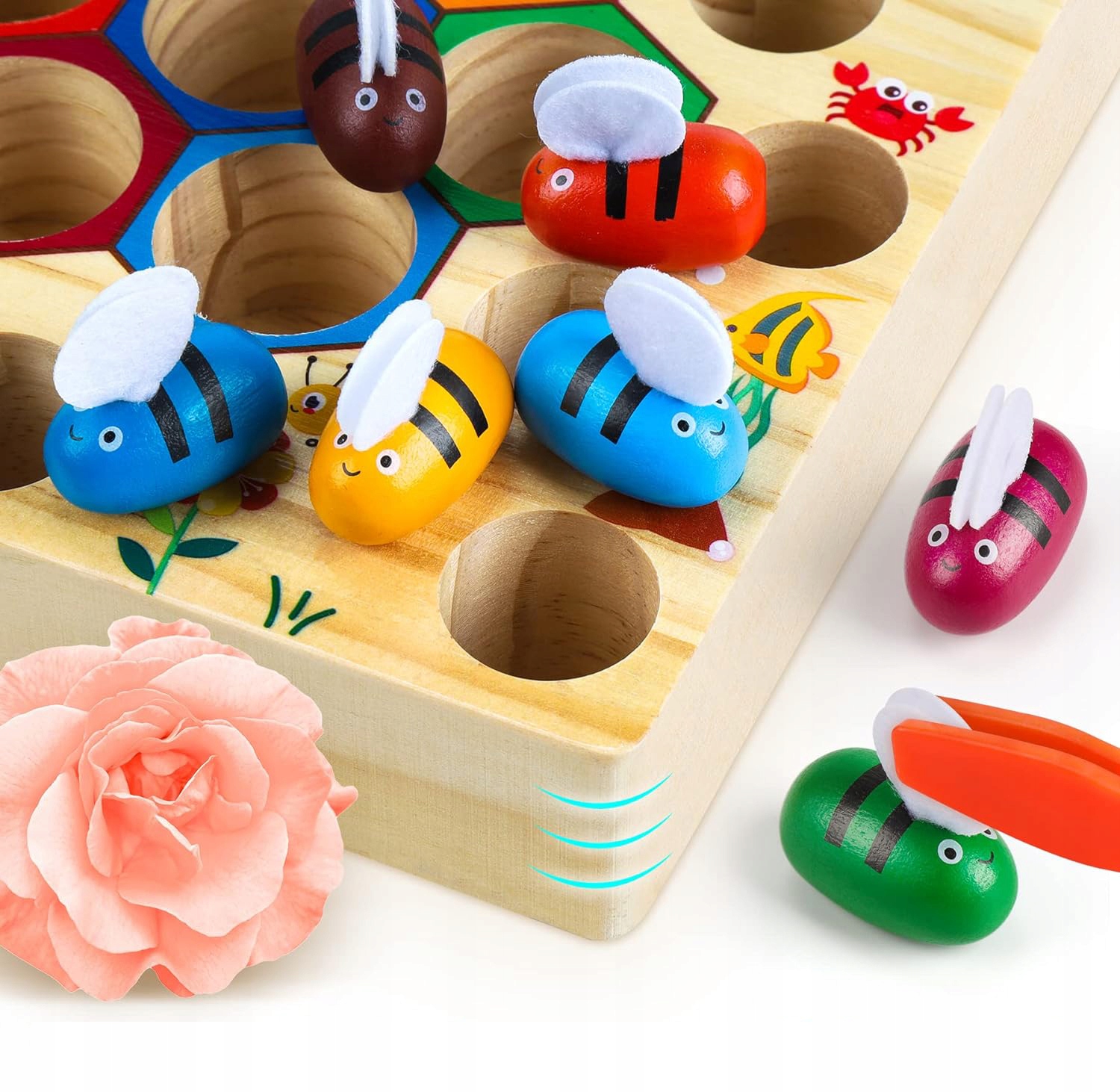 🐝🐝 [Веселые подарки для детей] Ребенок хватает удочку, чтобы поймать рыбку, которые могут тренировать силу рук ребенка и развивать мелкую моторику, а также подбор цвета и формы, отлично подходят в качестве подарка для дошкольников. Дети могут использовать зажимы, чтобы поместить 7 разноцветных пчел в свои гнезда, чтобы распознавать цвета и улучшать цветовую чувствительность детей.