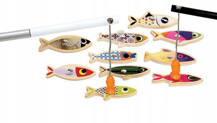 Французский магнитный набор для ловли сардин JANOD — это аркадная игра, которая тренирует координацию и терпение, а также помогает различать узоры. В набор входят 10 больших (8,7 х 3,5 см) разноцветных рыбок с магнитами и две удочки, также отделанные магнитами, с помощью которых можно ловить этих рыбок (ловить удочкой). Это идеальная игрушка для двоих детей.