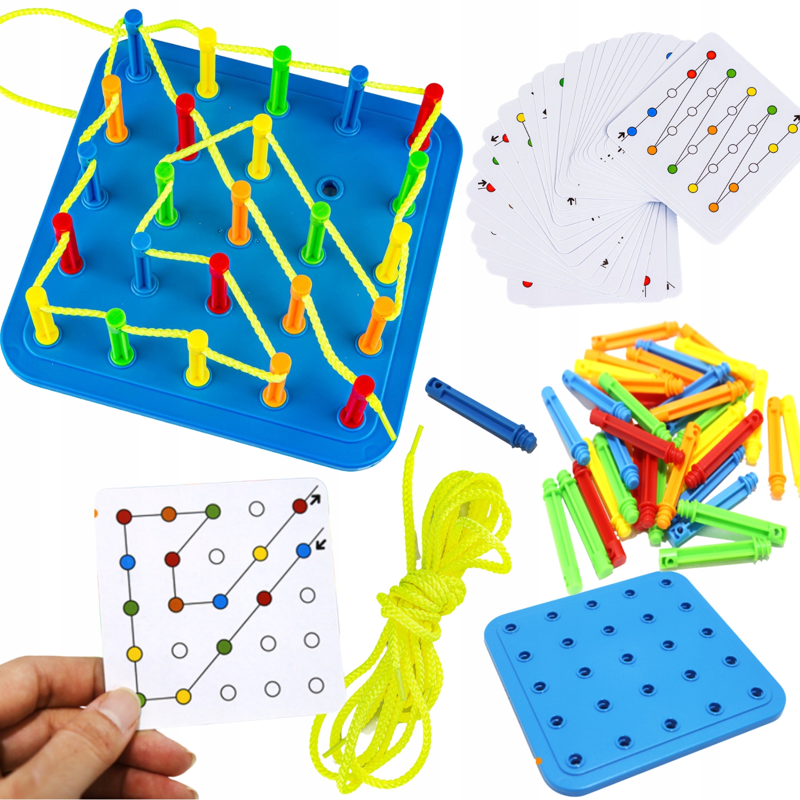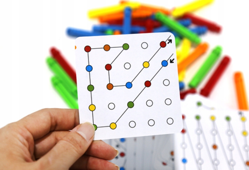 Идея состоит в том, чтобы вынимаем одну из карточек, и нам нужно воссоздать такую же композицию на доске с отверстиями. В отверстия вставляем палочки отдельных цветов так, чтобы они соответствовали расположению на нашей открытке. Затем продеваем веревку так, чтобы она совпадала с карточкой. Задача игроков — провести веревку через эти элементы определенным образом.