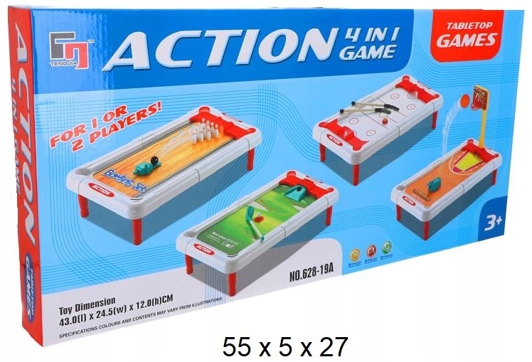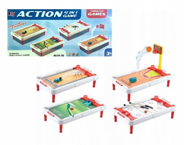 Набор со столом, сменными досками и аксессуарами, благодаря которым мы сможем играть в 4 разные игры!
