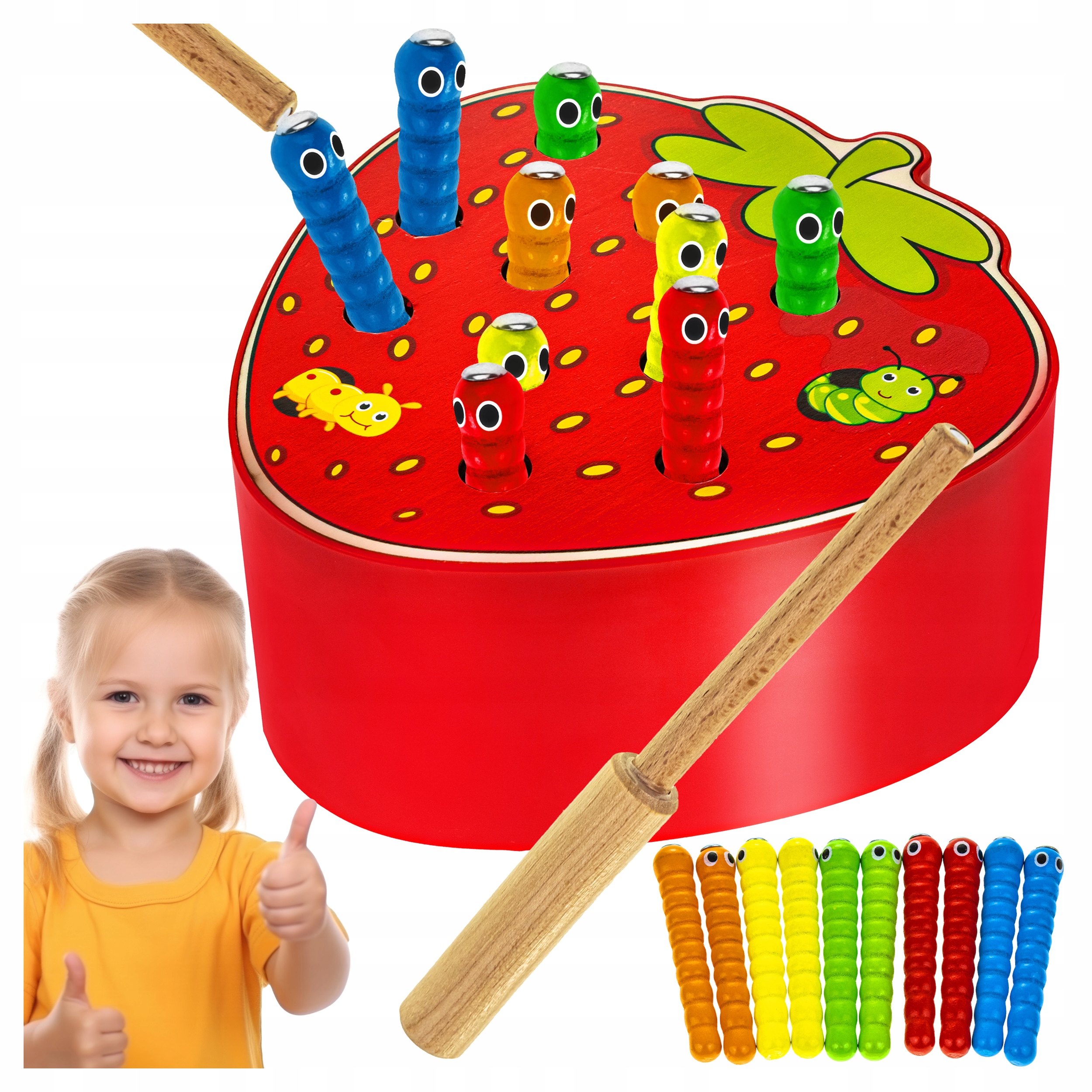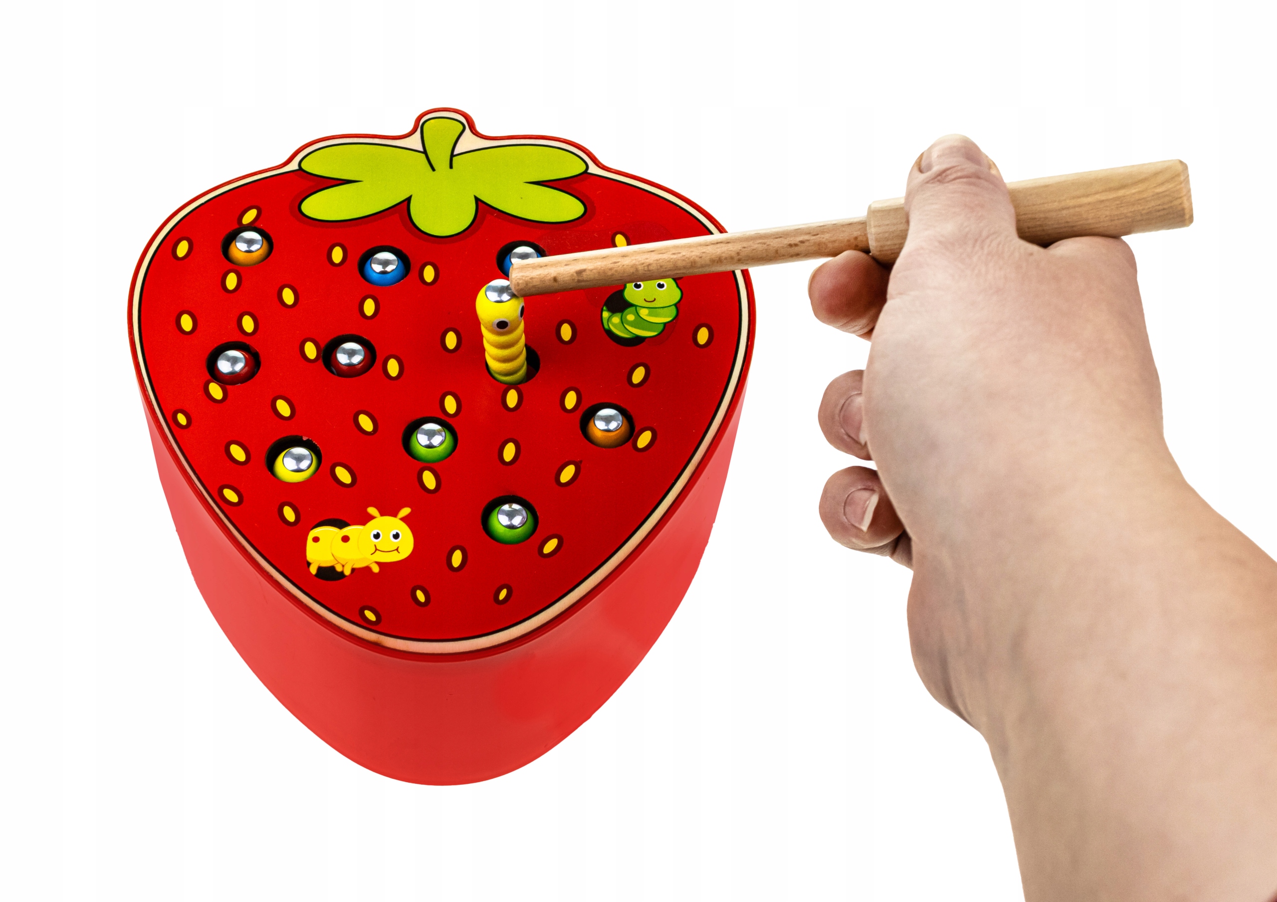Игра заключается в том, чтобы ловить червячков, спрятанных в отверстиях фруктов, деревянной палочкой с магнитом, а затем вставлять их обратно.