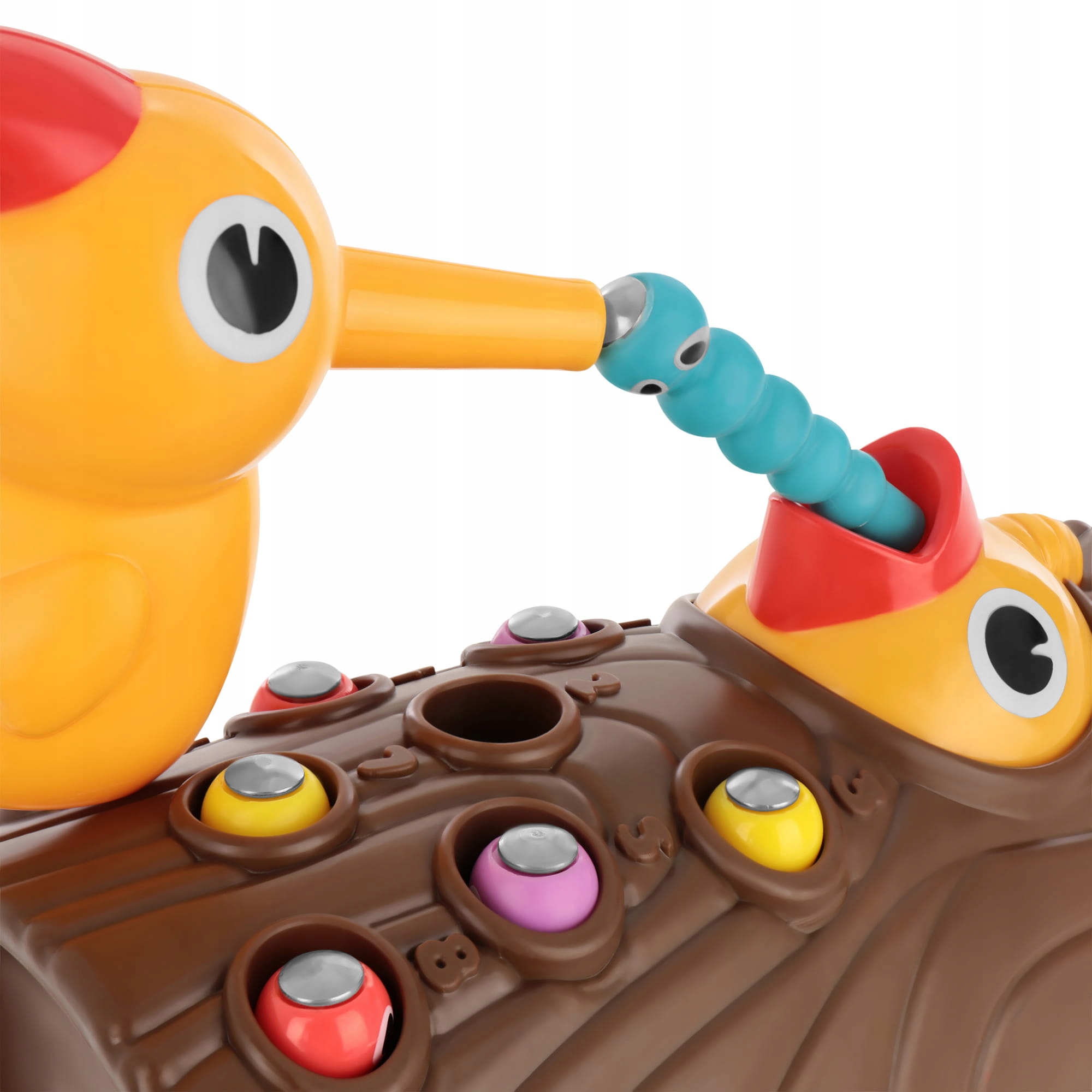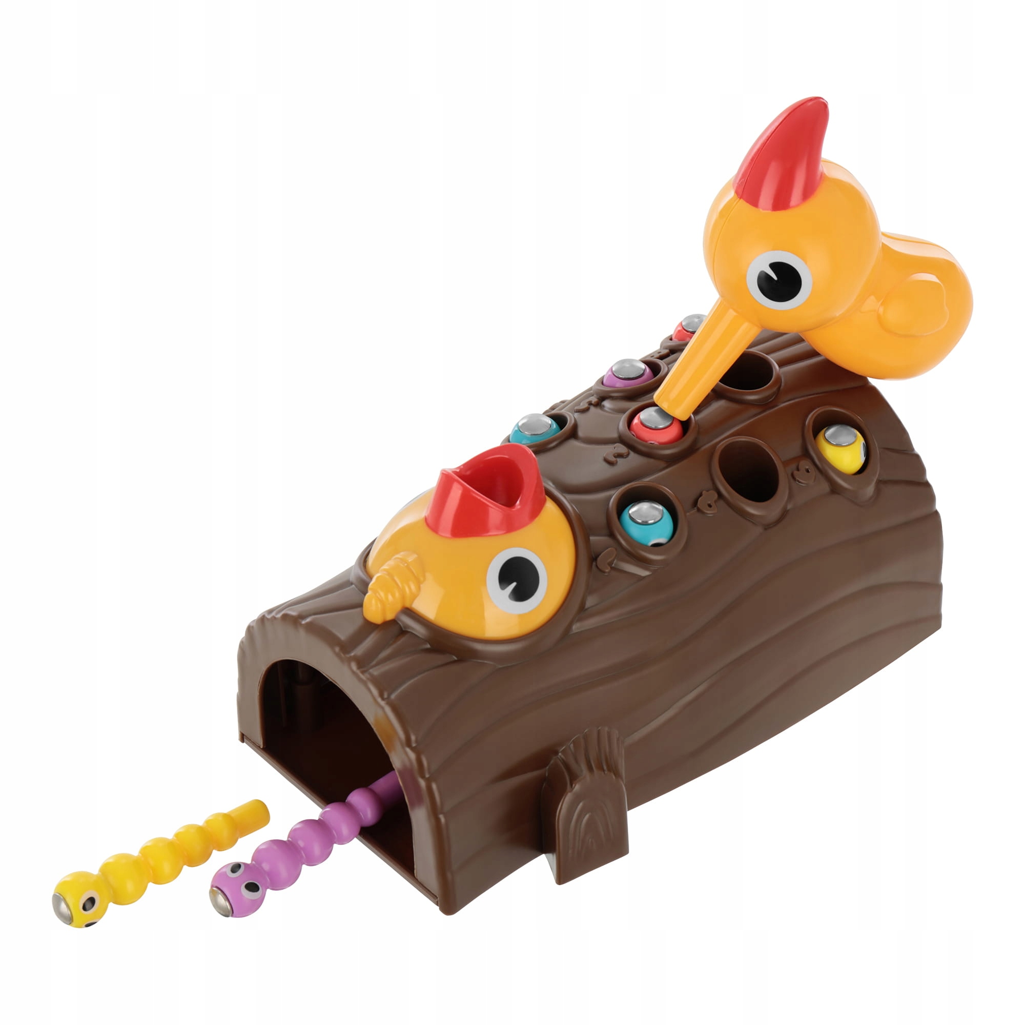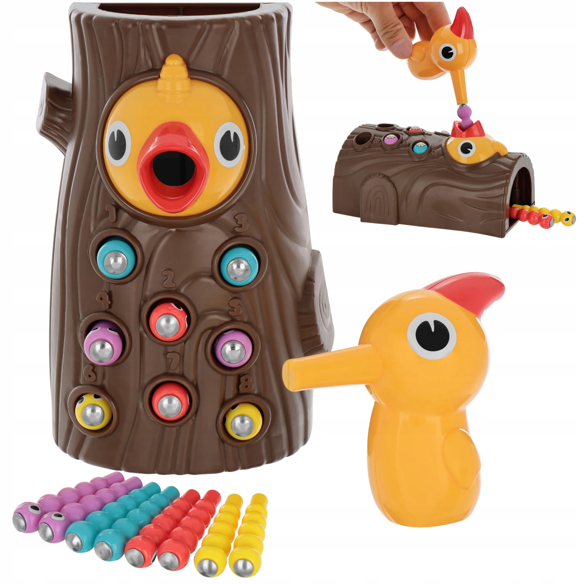 В набор входят маленькие жучки четырех цветов и птичка с магнитом на клюве, с помощью которого вам нужно переместить червяка из норы в клюв.
