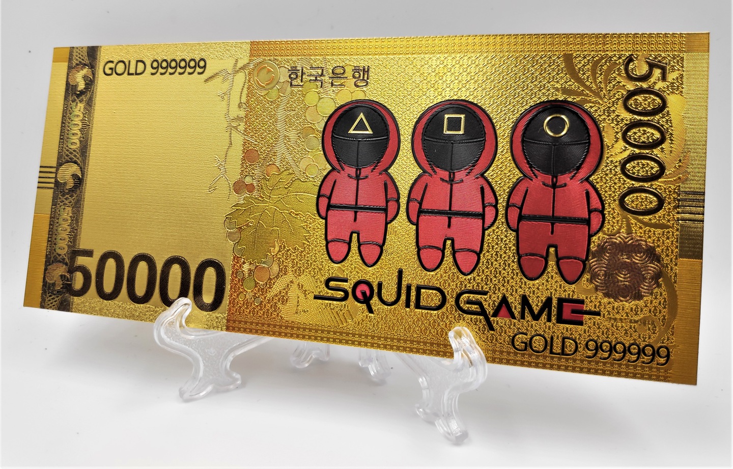 Предлагаю на продажу красивую позолоченную коллекционную банкноту номиналом 50 000 вонс мотивом из культовой серииИгра в кальмара.