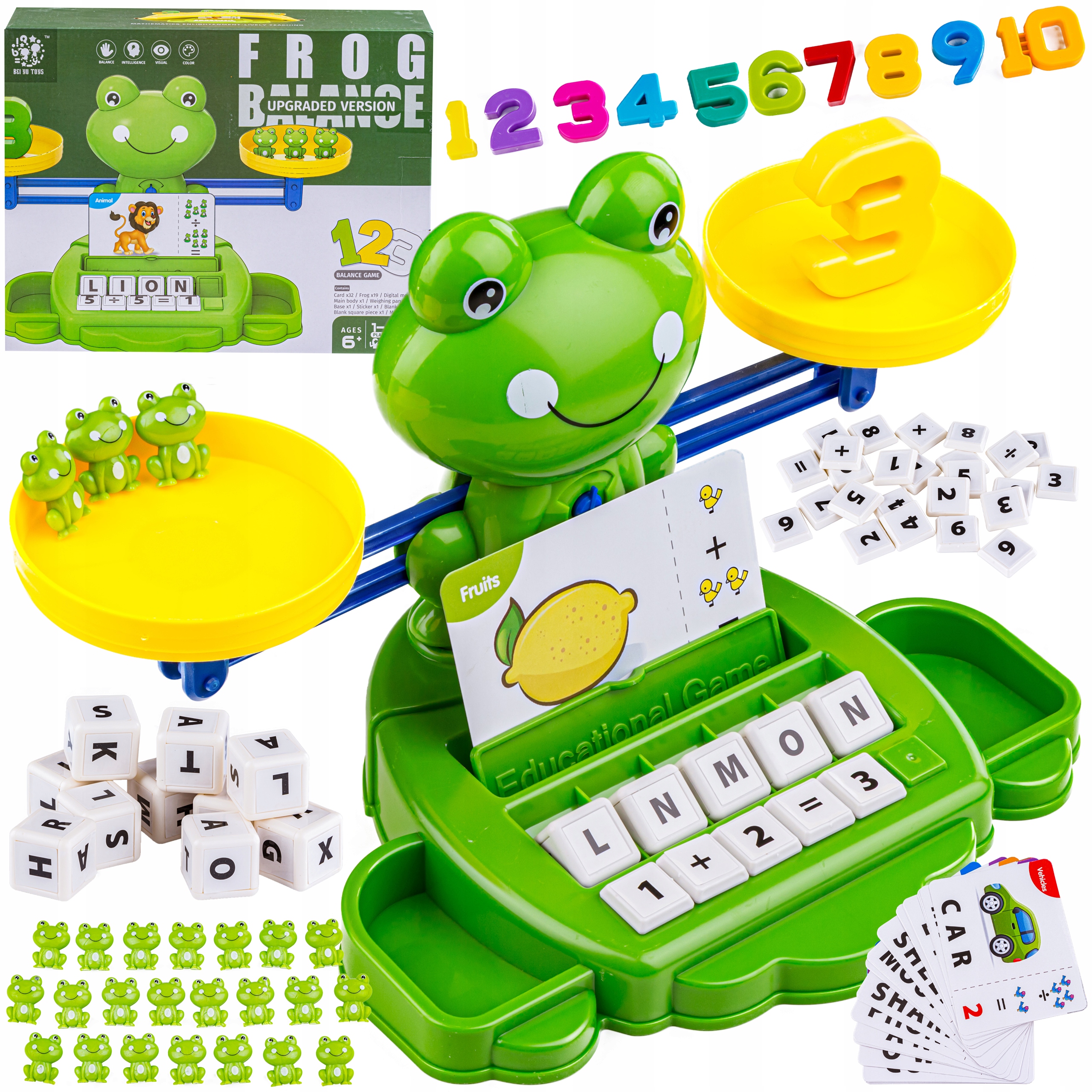 Посмотрите на чудеса этой игрушки: красочные весы с фигуркой большой лягушки, гири в виде маленьких лягушек, цифры и карточки с заданиями и карточками. изучение английского языка позволит вам развлечься на долгие часы интересных развлечений, которые приведут вас к увлекательным открытиям!