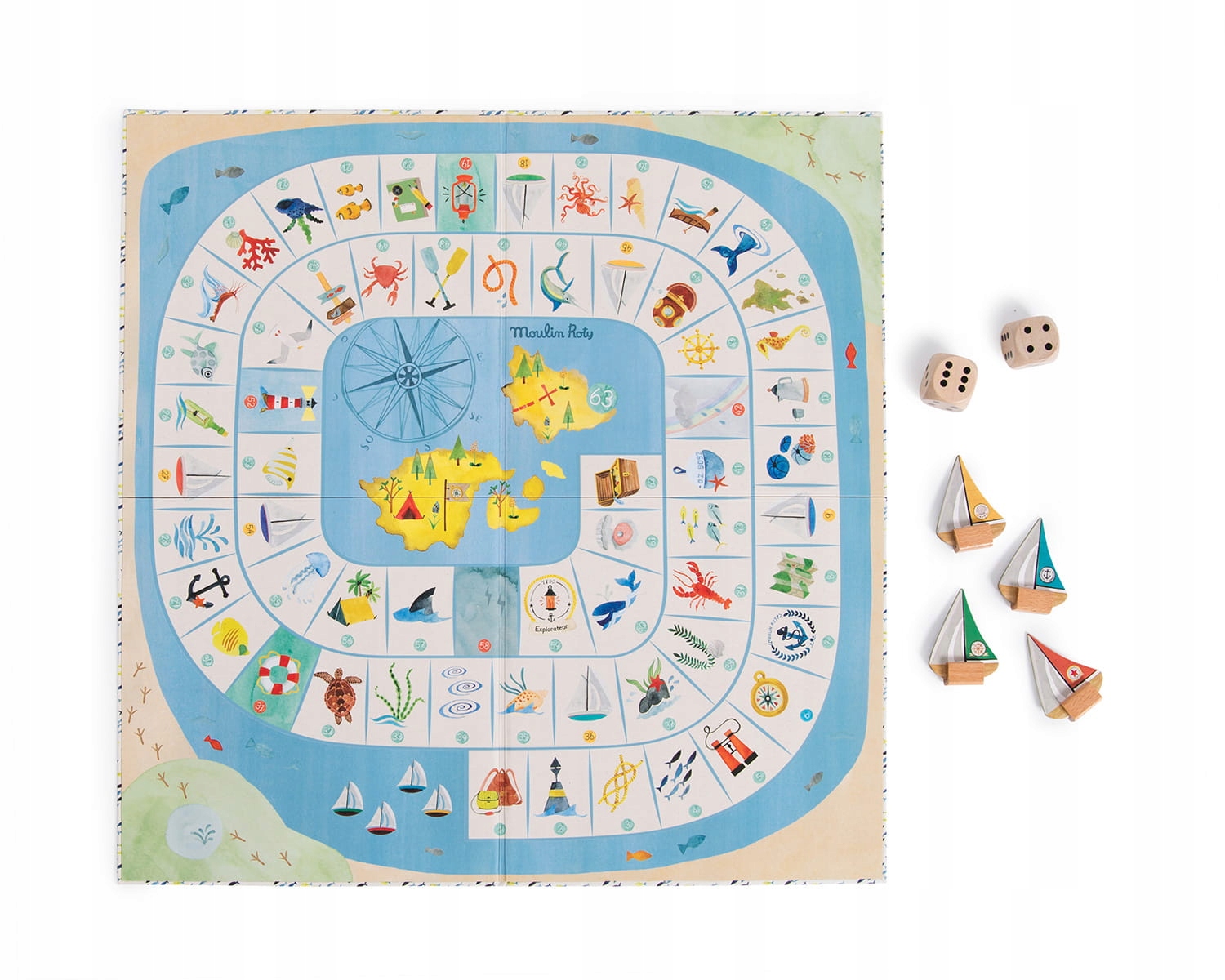 В игре есть 4 лодки, 2 больших игральных кубика и доска, нарисованная акварелью.