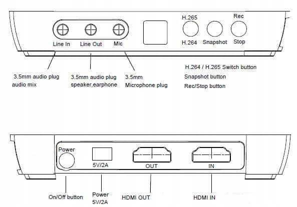 - Захват 1080 при 60 Гц через micro USB на ПК Windows, Linux, Mac, вход для микрофона, линейный аудиовход и выход, захват на USB 2.0, запись H.264 / H.265, звук 48 кГц PCM AAC, максимальный битрейт 20 Мбит/с