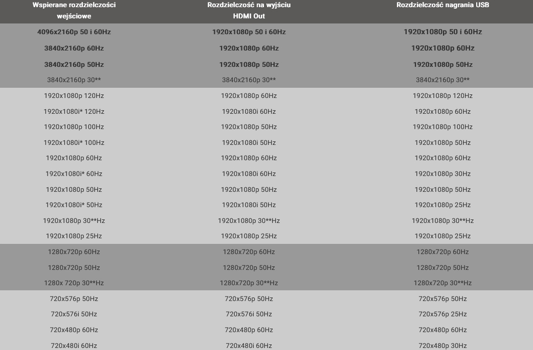 Граббер принимает входные сигналы до 4K 60 Гц, 4K 30 Гц, 1080p 60/120 Гц и записывает с максимальным разрешением до 1080p 60 Гц, 4K 30 Гц, 1080p 60/120 Гц соответственно. Примечание: это не относится к чересстрочным сигналам — тогда устройство снижает частоту кадров (60Гц->30Гц, 50Гц->25Гц). Подробнее в таблице поддерживаемых разрешений во вкладке «Технические данные».