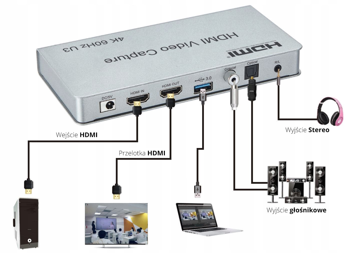 Устройство, позволяющее записывать видео высокого разрешения с внешних источников через HDMI-кабель на внешний носитель, подключенный к USB 3.0. Оснащен выходом HDMI, вы можете постоянно контролировать изображение на подключенном телевизоре или мониторе. Устройство также выполняет функцию экстрактора HDMI — позволяет разделять изображение через HDMI и звук через оптический, 3,5-правый или коаксиальный разъем.