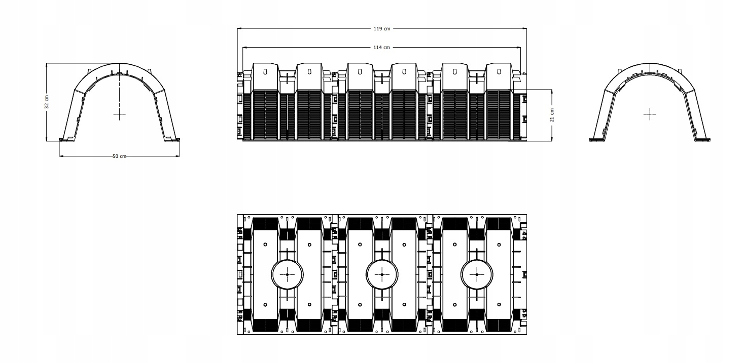 Инфильтрационные камеры емкостью 130 литров изготовлены с использованием современной технологии литья пластмасс. Дополнительные ребра укрепляют конструкцию как на боковых стенках, так и на своде, что делает их прочными и долговечными.