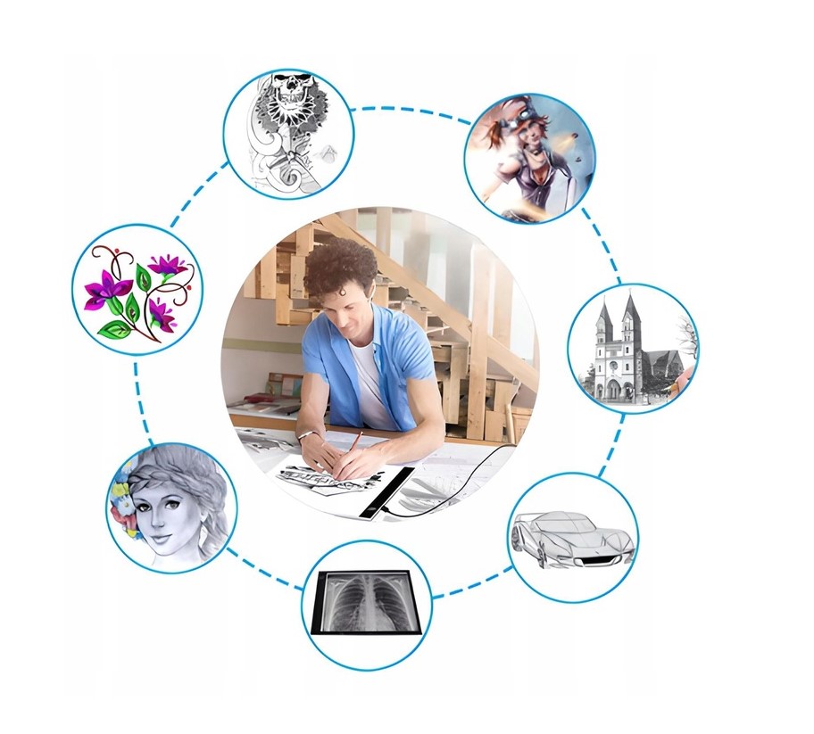 Наша доска для рисования предлагает 3 уровня подсветки, которую вы можете легко настроить в соответствии со своими потребностями. Выберите соответствующий уровень, нажав кнопку включения и осторожно проведя по нему пальцем. Благодаря этому можно получить оптимальное освещение для комфортного и точного копирования рисунков.