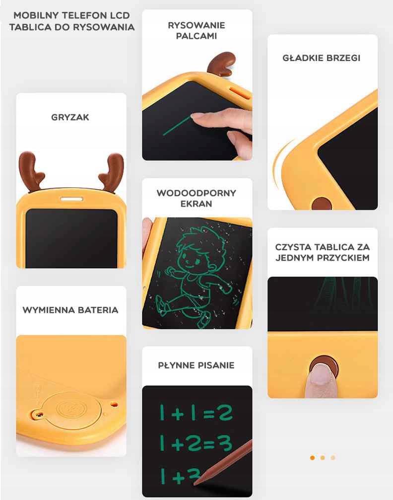 Легкий и прочный 4,4-дюймовый планшет-смартфон марки WOOPIE, используемый для рисования или учимся писать. Вы можете использовать его как дома, так и в путешествии, творить, писать, рисовать и считать, а затем удалить сохранение одной кнопкой и начать веселье заново. Очень чувствительная матрица позволяет ребенку писать входящим в комплект стилусом точно так же, как карандашом. Толщину линии можно регулировать в зависимости от силы давления. Планшет имеет блокировку, предотвращающую случайное удаление рисунка.