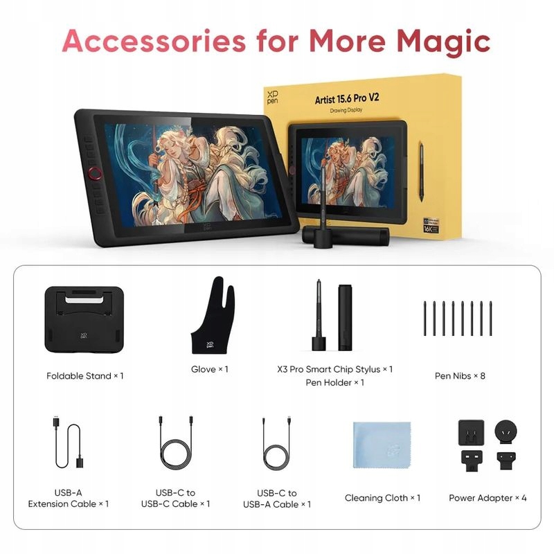 В свою очередь, его эргономичная форма с резиновой поверхностью и парой программируемых кнопок гарантирует комфорт использования даже в течение многих часов без усталости. Характерным элементом дизайна XPPen Artist 15.6 Pro V2 является легендарное красное поворотное колесо и 8 клавиш быстрого доступа на боковой стороне дисплея. Их можно запрограммировать так, чтобы обеспечить быстрый доступ к часто используемым функциям и тем самым значительно ускорить рабочий процесс. Разумеется, существует также поддержка жестов мультитач управления, например для быстрого увеличения или уменьшения масштаба. Благодаря относительно компактным размерам (442,9×279,9×12,9 мм) и небольшому весу (1,4 кг) этот планшет для рисования станет идеальным спутником в путешествии. В комплекте вы найдете все необходимое, чтобы сразу приступить к работе — помимо планшета и ручки, есть практичная складная подставка, набор запасных насадок, кабель с переходниками и даже специальные перчатки для предотвращения нежелательных прикосновений во время рисования.
