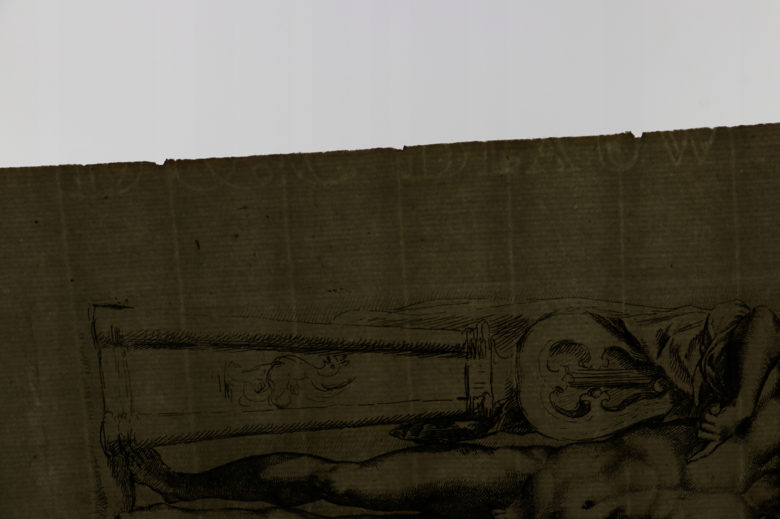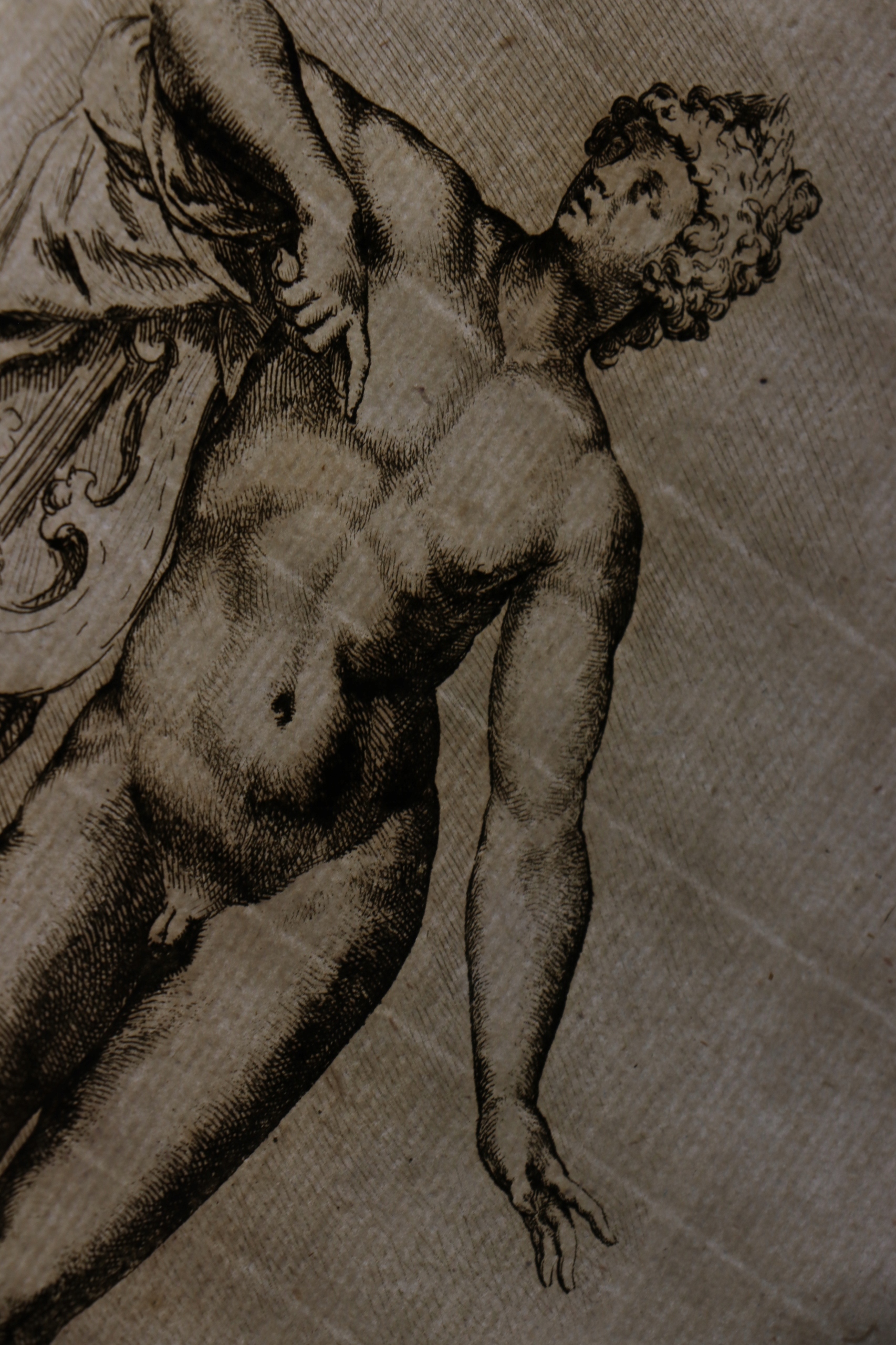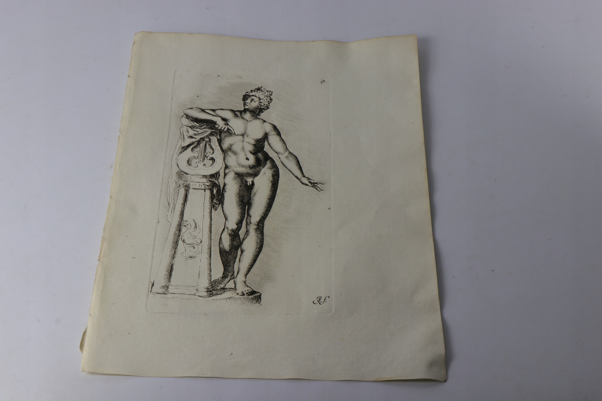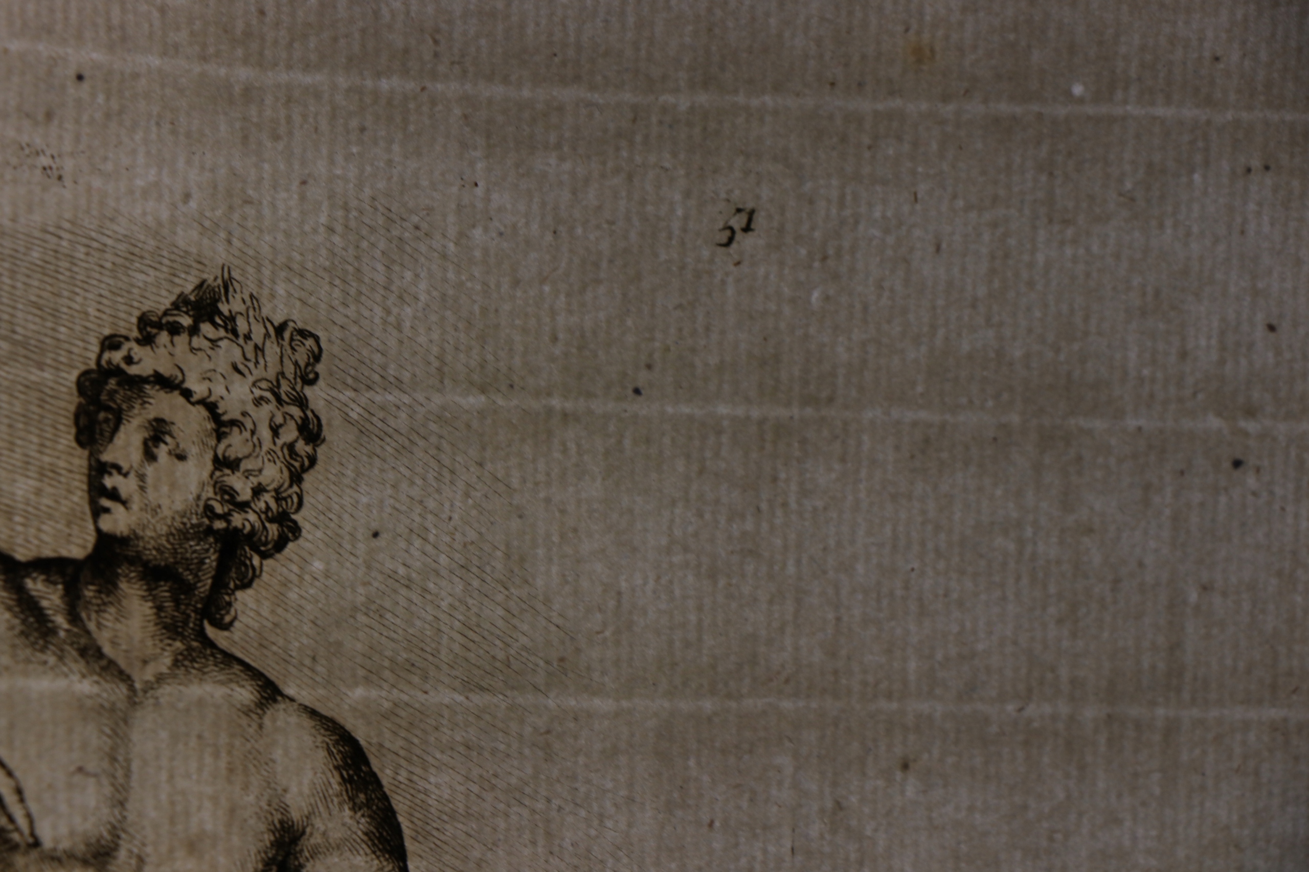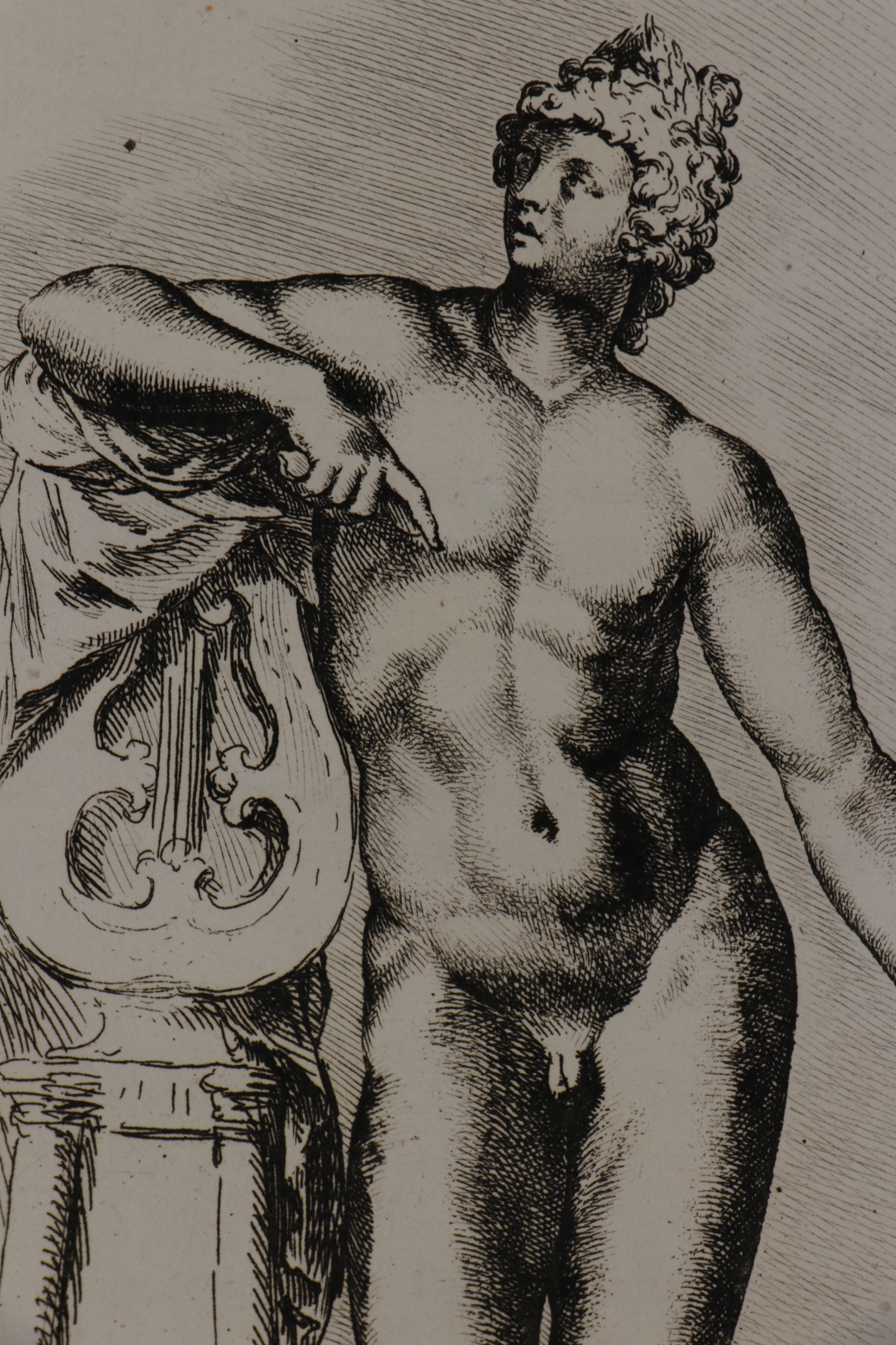 Графика меди с изображением Аполлона, сделанная голландским художником и гравюрой Ян де Биссшоп, также известный как Йоханнес Епископий (1628 1671). Графика, основанная на скульптуре в галерее Уффизи во Флоренции Римская копия, с 2 -го века н.э. Это копия бронзовой фигуры знаменитого греческого художника Паксителеса с 365-350 г. до н.э., изображающая Аполлон Сауроктонос (консоль Джашцзур), Косима Медичи и статую, называемую Аполлоном Цитароедусом, т. Е. Игра в Лире. Бумага. Paper