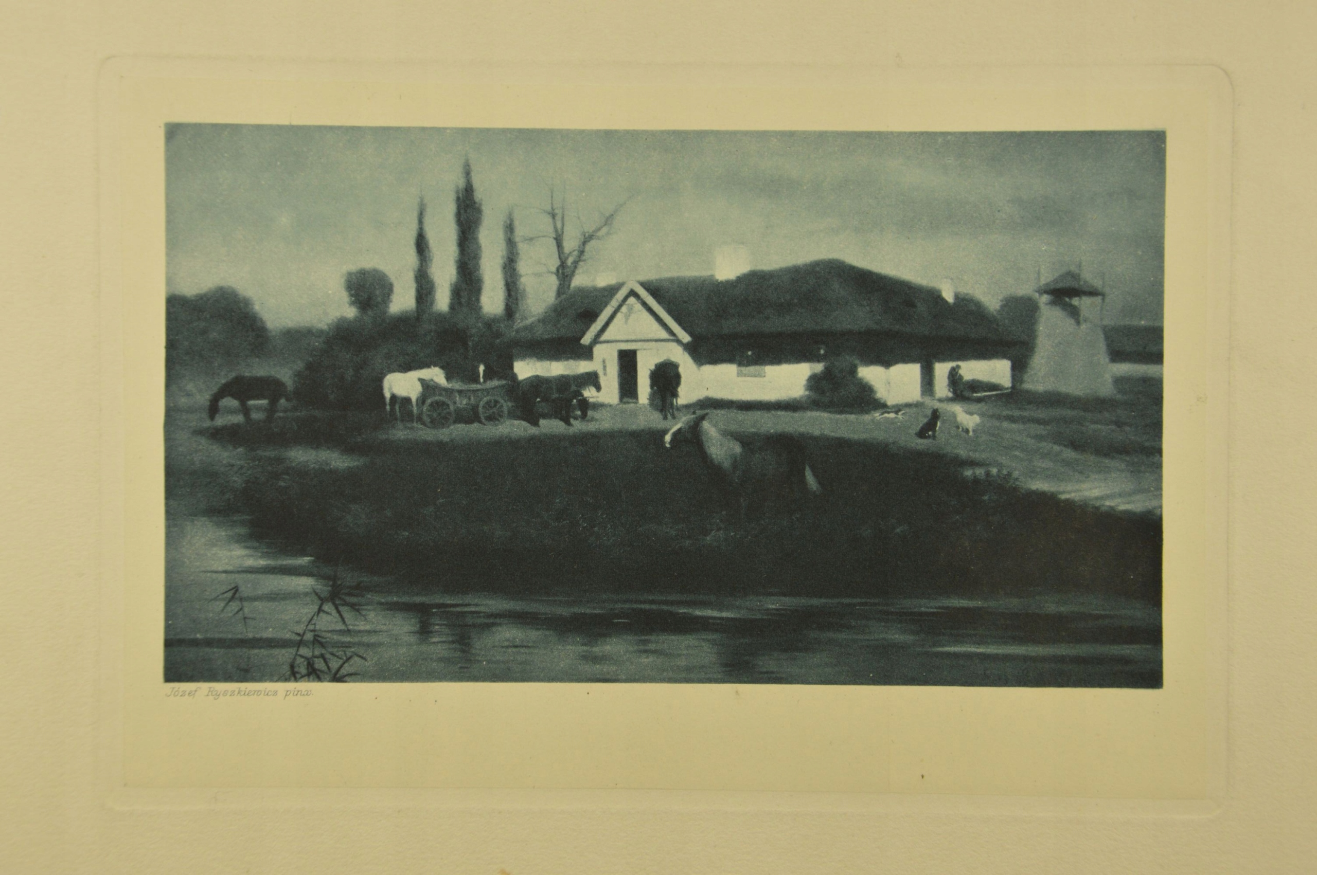 Оригинальная, довоенная графика / пинкс, гелиогравюра деревня Юзефа Рышкевича. Рисунок подписан, видны старые пятна и изменения цвета.