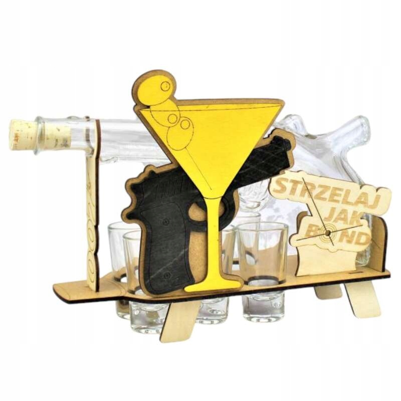 Графин стеклянный емкостью 0,5 л с пробкой в комплекте с бокалами. Подставка для графина с гравировкой ...Снимай как Бонд... изготовлена из древесных материалов. Изделие имеет пятна. В комплект также входит фольга и красочная рафия, необходимая для упаковки подарка. Графин для водки на подставке – элегантное и стильное дополнение любого домашнего бара или подарок любителю качественного алкоголя. Графин изготовлен из прочного стекла, что гарантирует долговечность и легкость в уходе. Оригинальная форма подставки придает этому набору неповторимый характер, придавая ему нотку оригинальности и индивидуального подхода. Бокалы идеально подходят к графину, создавая гармоничный комплект, который непременно будет выделяться на столе во время встреч с друзьями или семейных торжеств. Это определенно уникальная идея подарка, которая понравится каждому любителю тематики, связанной с сериалом «Агент 007»! Примечание В целях безопасности (стекло) во время путешествия каждая часть комплекта упаковывается отдельно и надежно закрепляется.Дополнительная информация По желанию заказчика мы можем дополнить универсальной вешалкой с надпись например . 100 лет, В день рождения, В день именин, Спасибо, Пенсионер, Исполнение мечты, Процветание, Я люблю тебя, Пенсионер, Начальник и т.д.