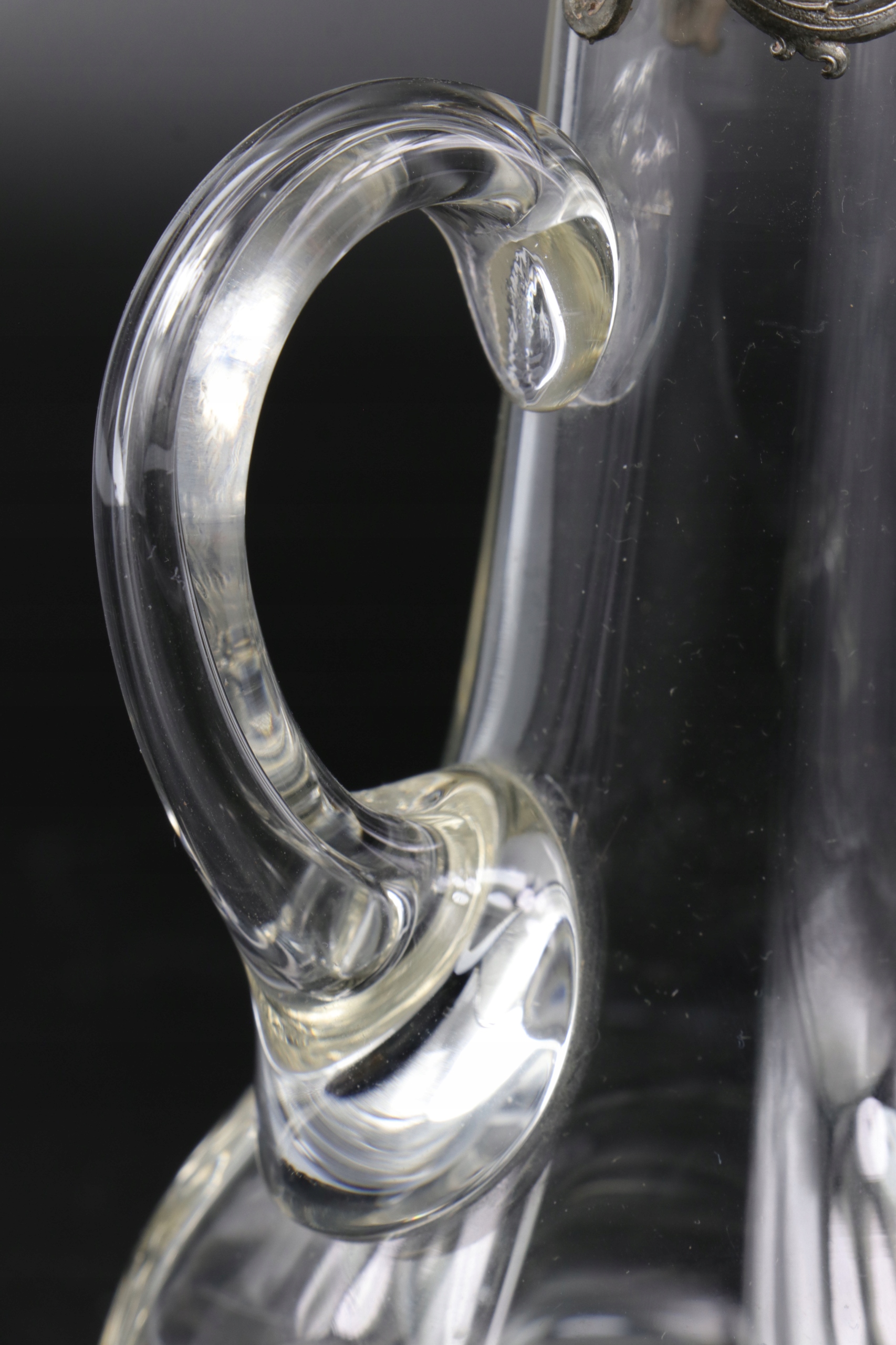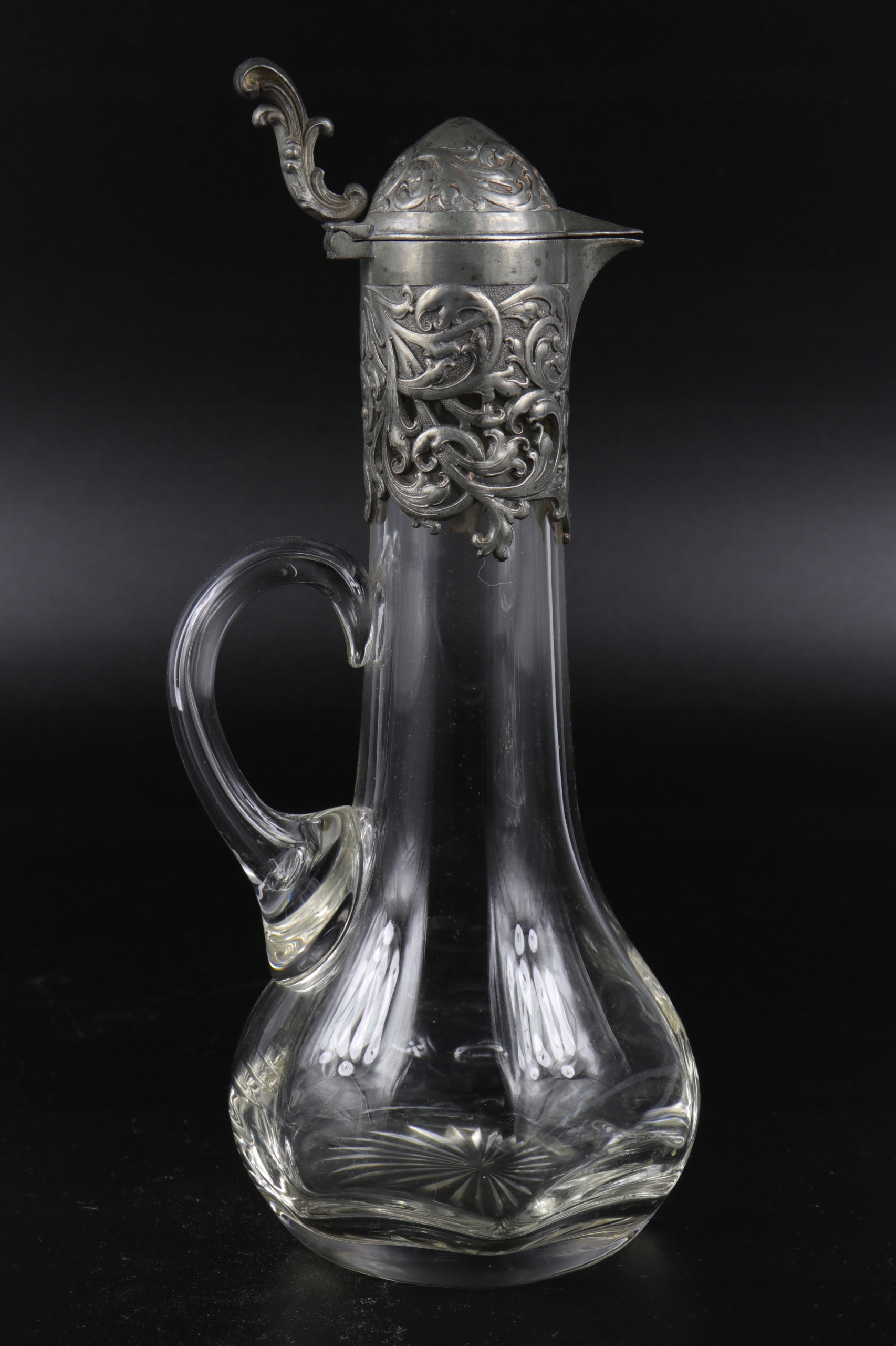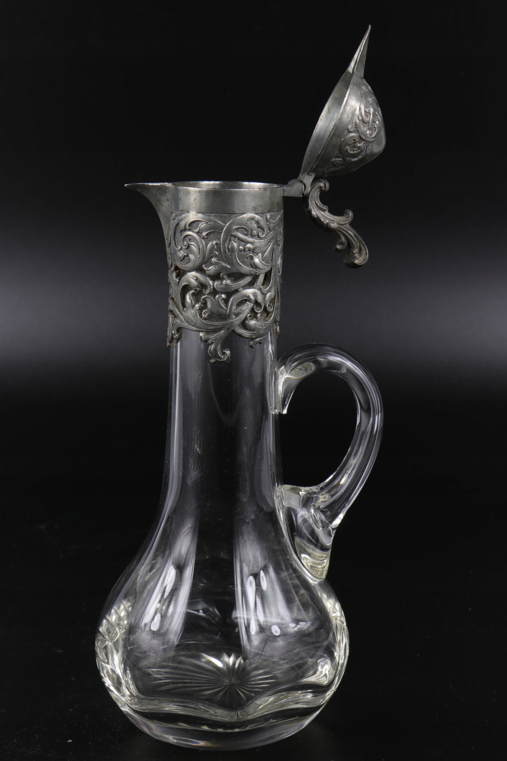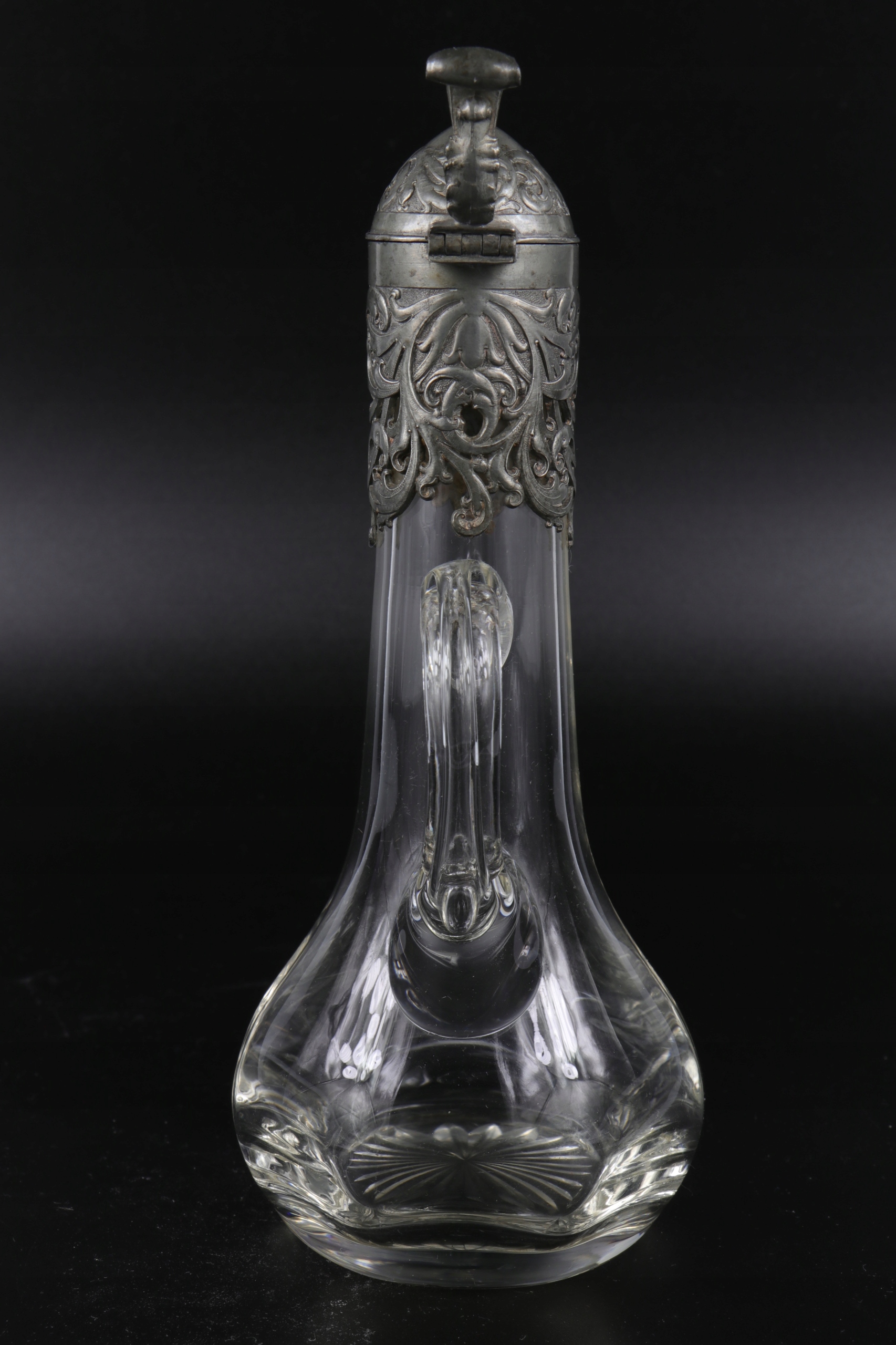 Хрустальный графин с очень богато украшенным жестяным воротником и крышкой графина. Красивый графин красивой формы, суживающийся к верху у основания, с характерной для компании Baccarat розеткой.