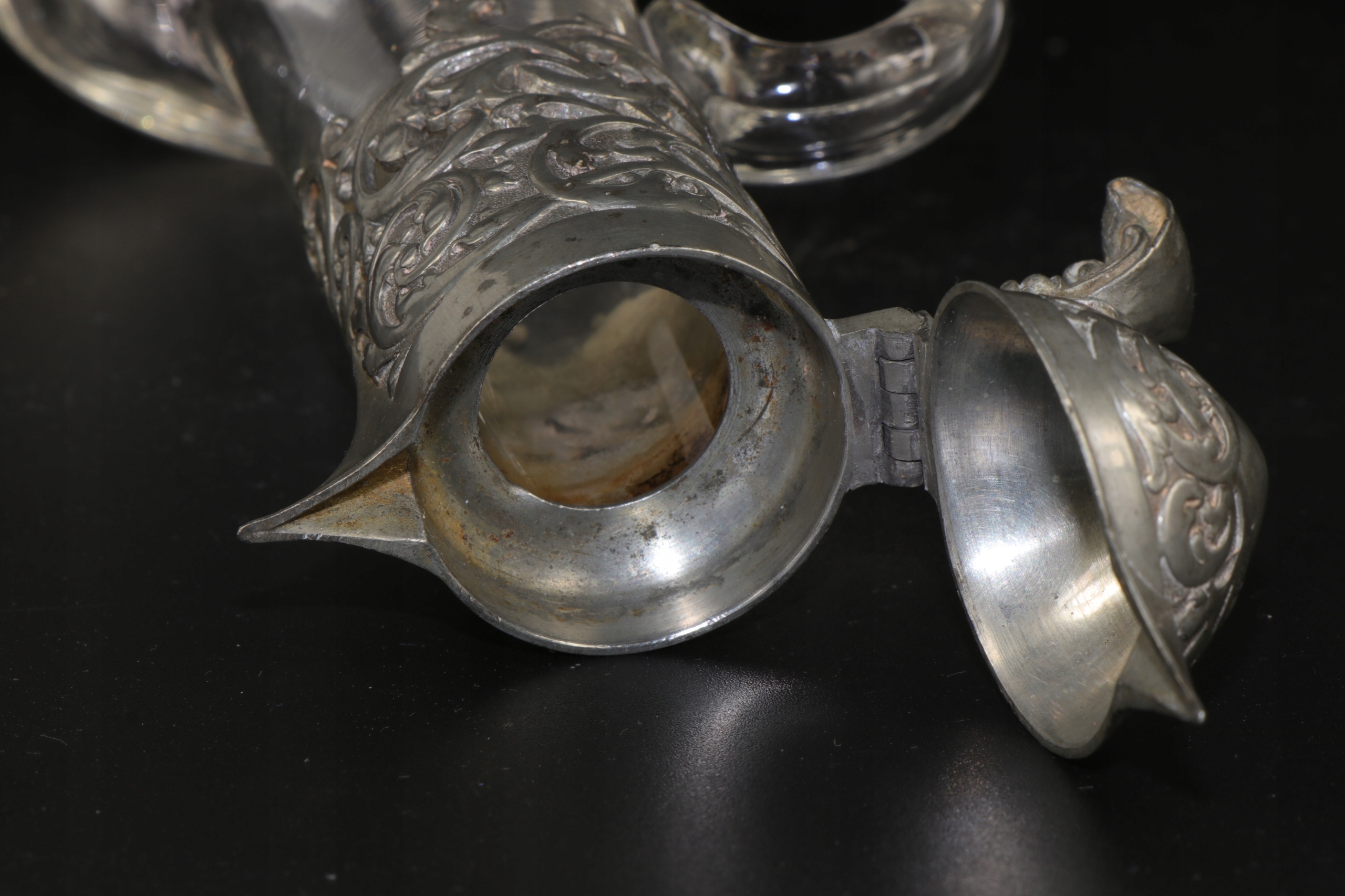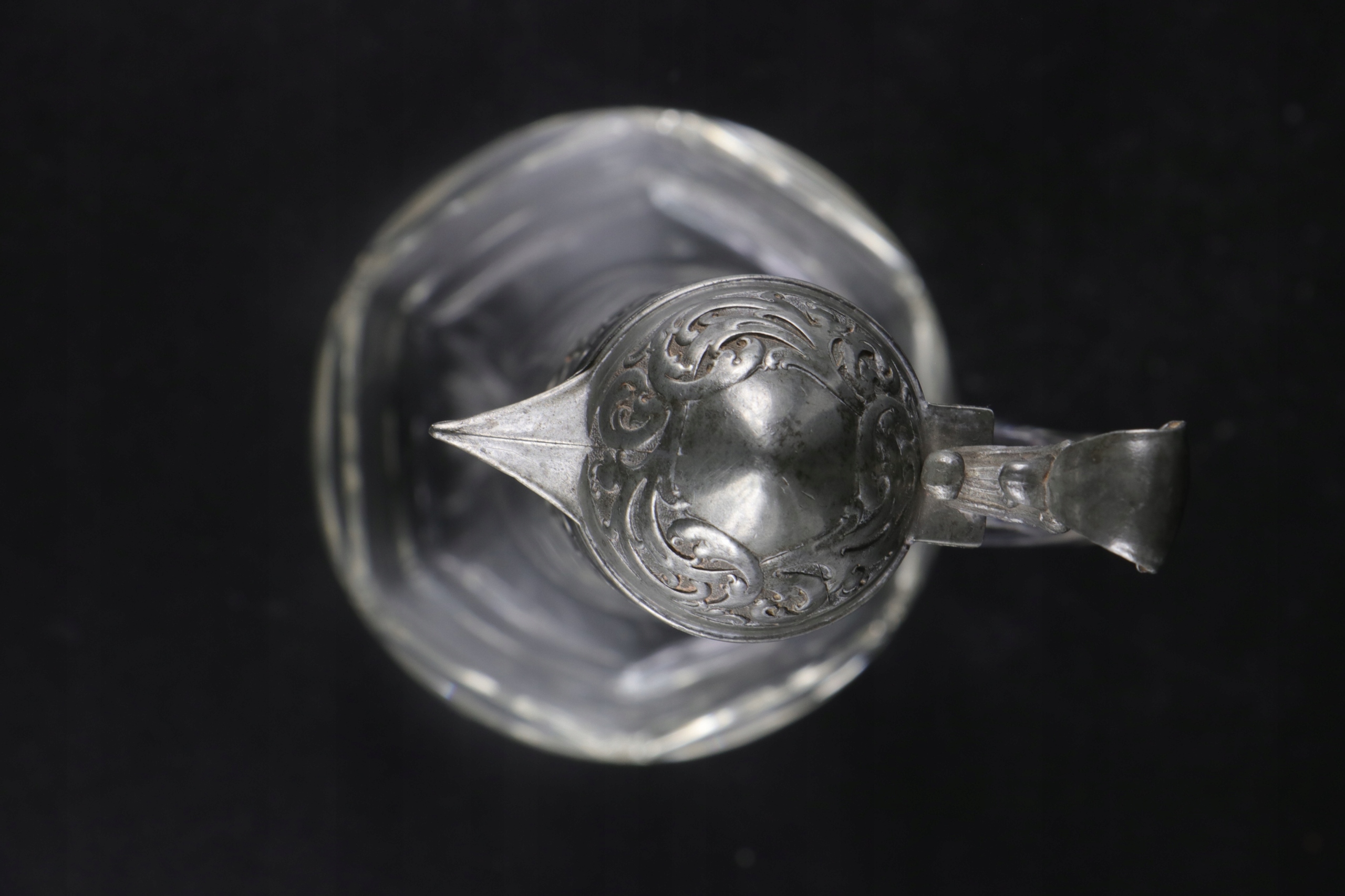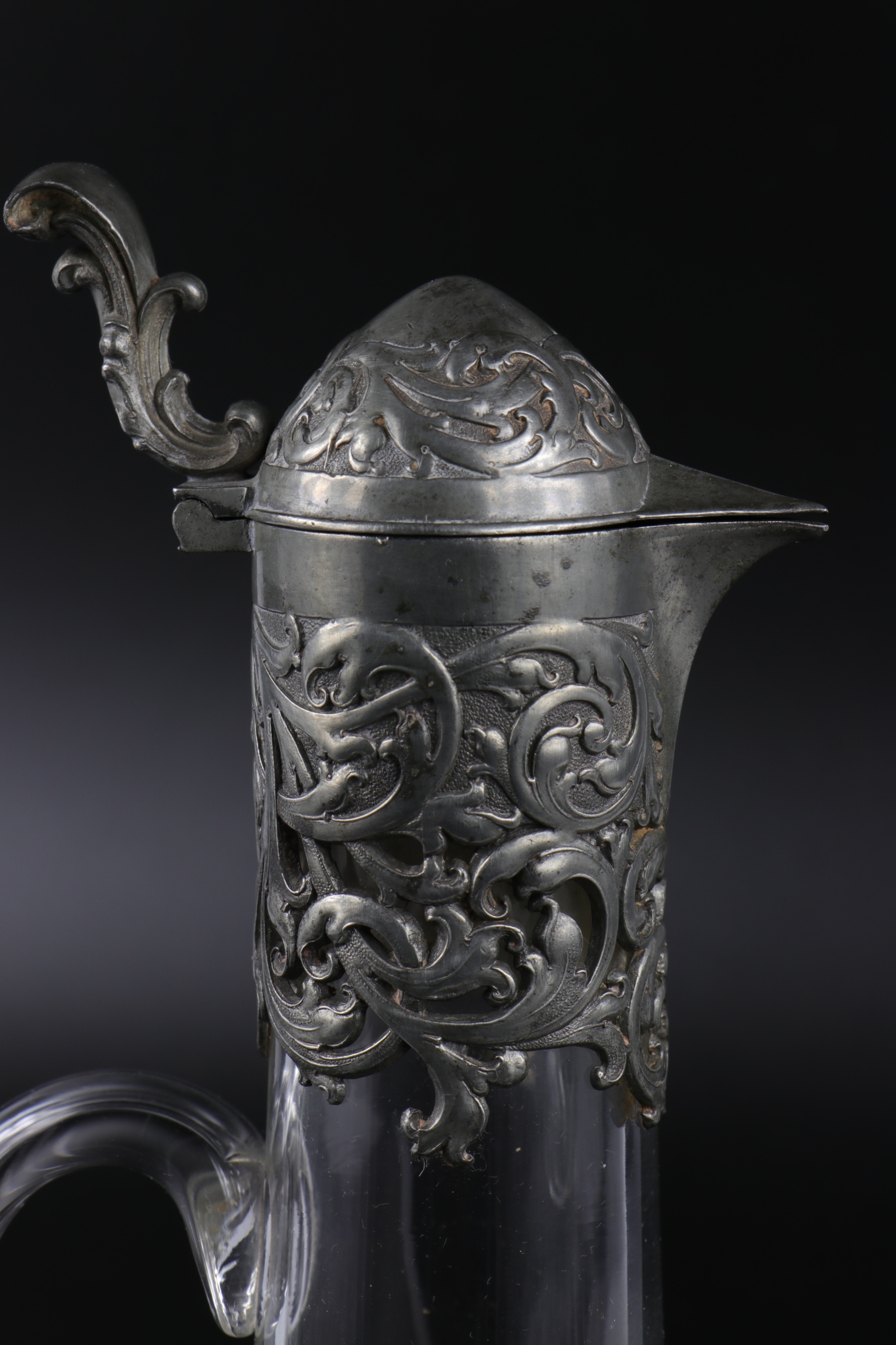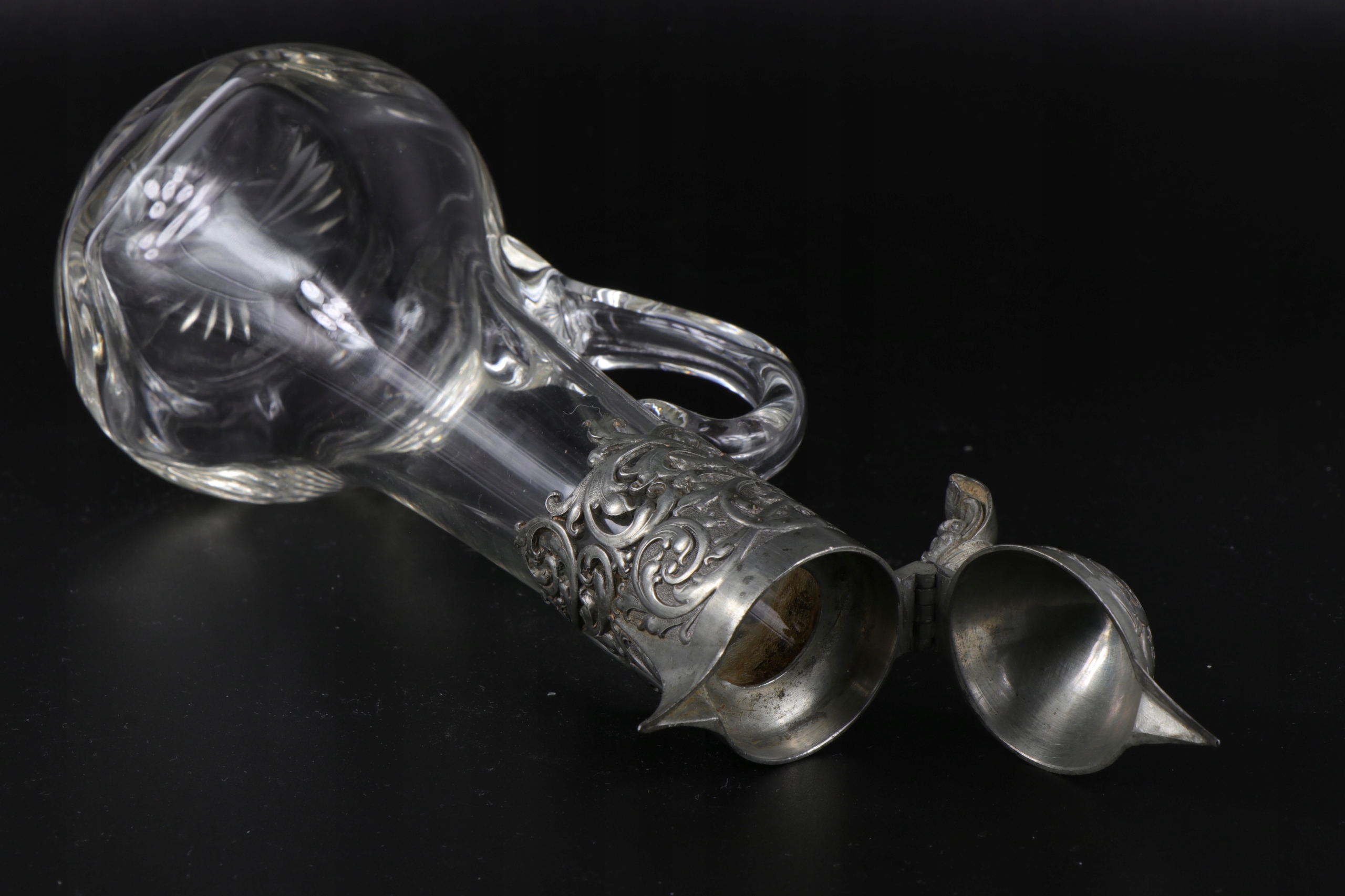 Хрустальный графин с очень богато украшенным жестяным воротником и крышкой графина. Красивый графин красивой формы, суживающийся к верху у основания, с характерной для компании Baccarat розеткой.