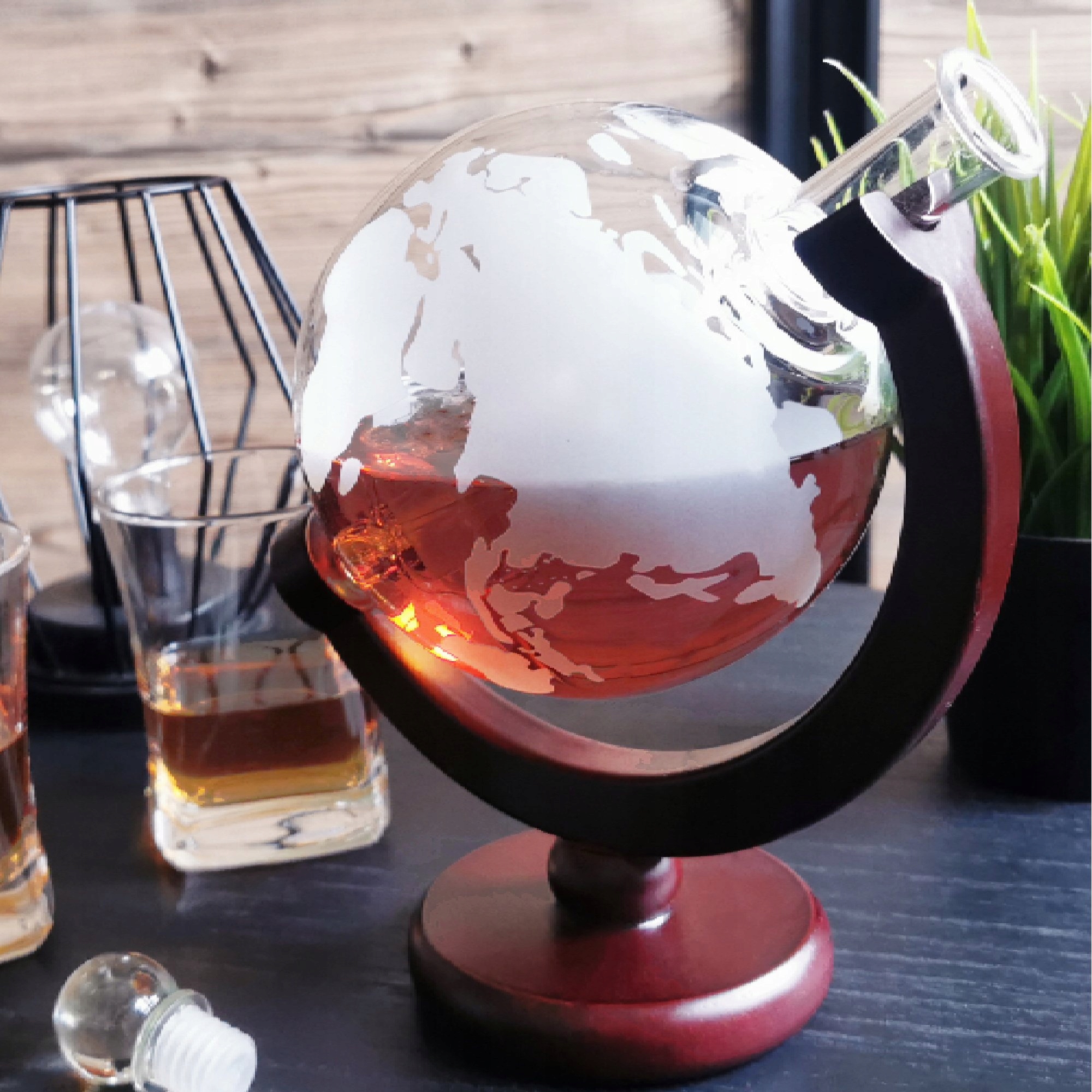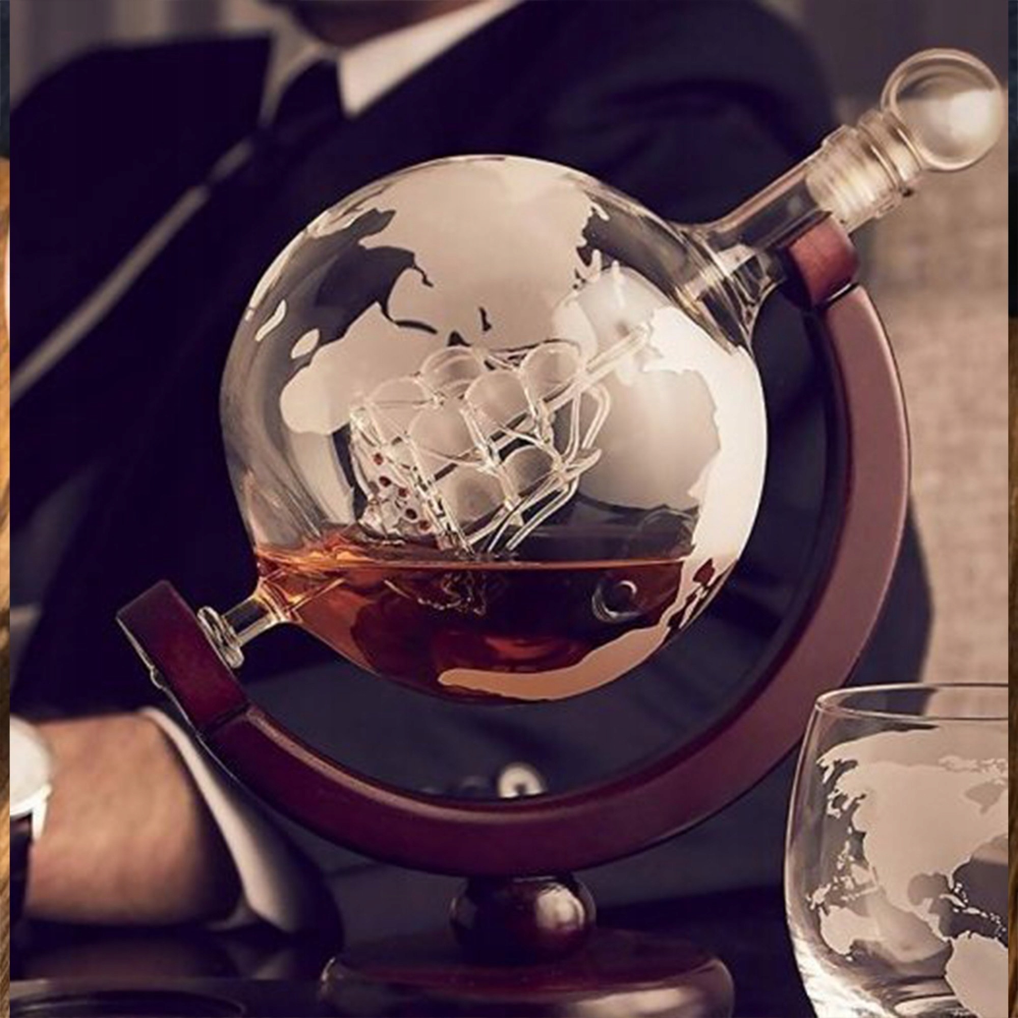 Вискиница в форме глобуса со стеклянным парусником изготовлена из высококачественного материала, в наборе с деревянной подставкой и двумя стаканами
