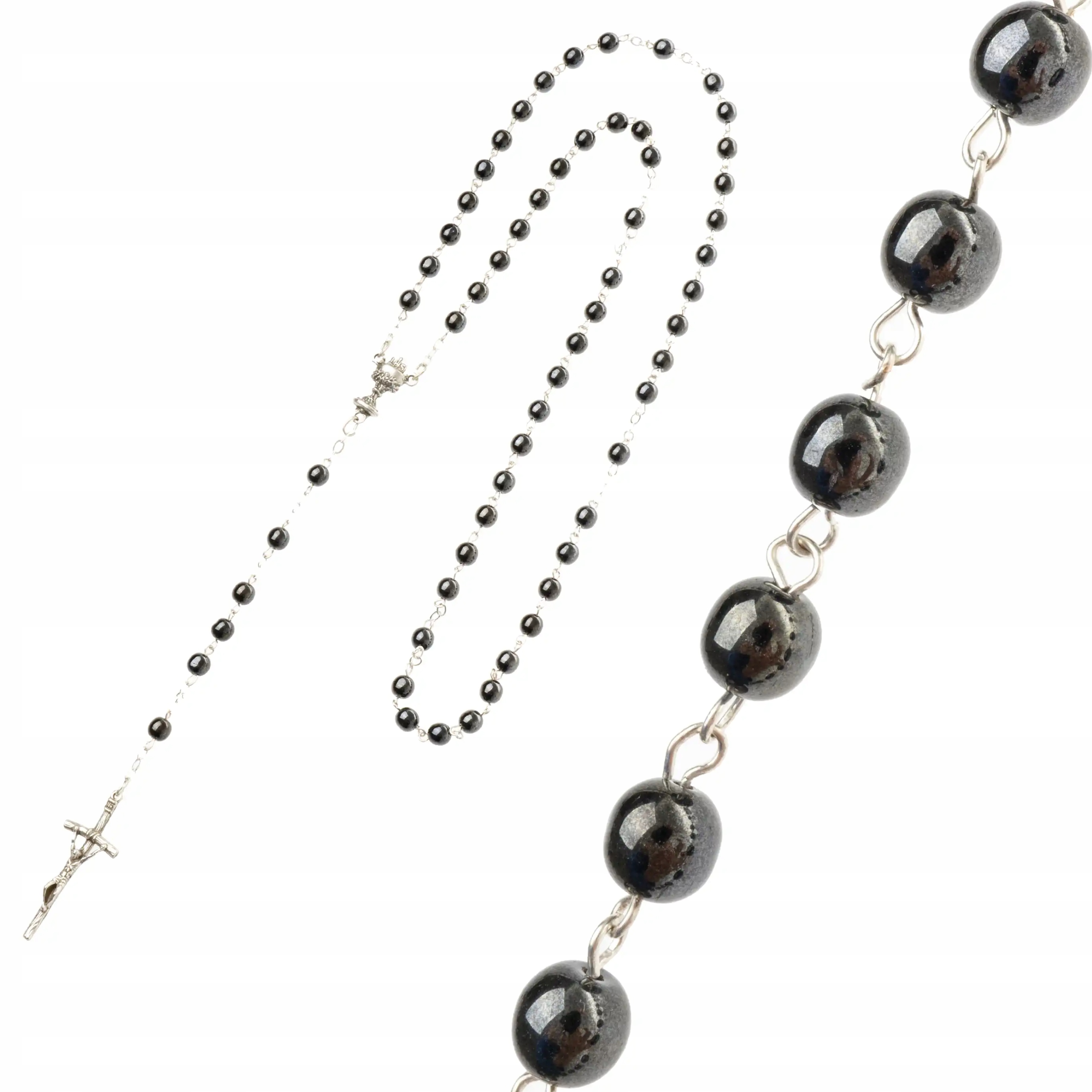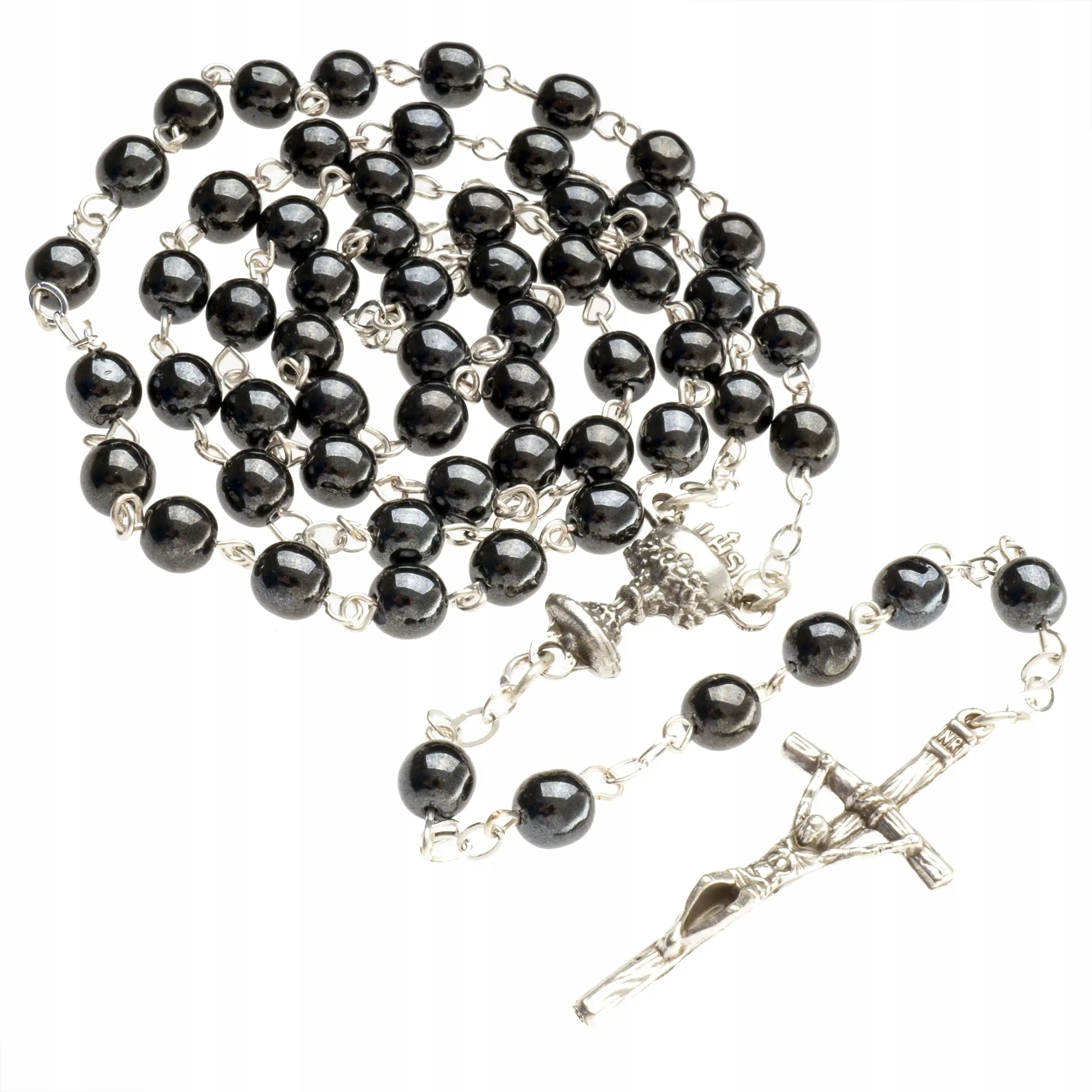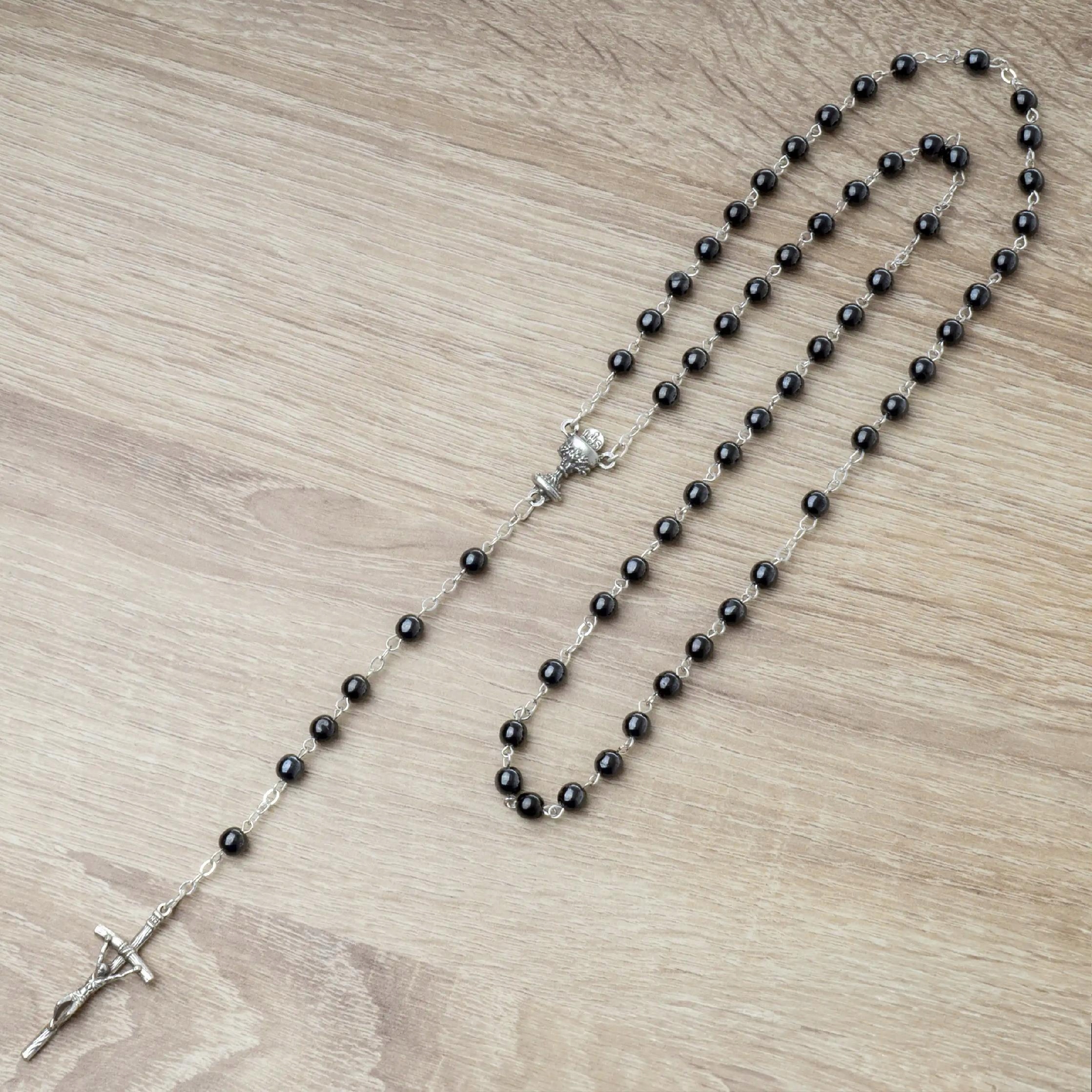 Весь четки (5 секретов) для Первого Святого Причастия для девушки. Четки изготовлены из НАТУРАЛЬНОГО КАМНЯ ГЕМАТИТА графитового цвета.