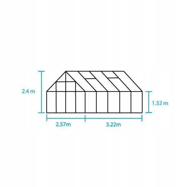 Теплица имеет 2 окна на крыше и интегрированные желоба. Перевещание, полностью сделанная из алюминия и 3 мм садового стекла. Окна устанавливаются в строительстве без использования связующего на резиновых прокладках с использованием специальных зажимов. окна разделены как на боковых стенках, так и на крыше и прикреплены на крючках, видимых на картинках.