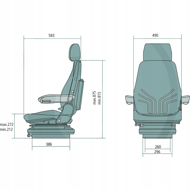 Технические данные:: • удобное сиденье с механической подвеской • ножничная подвеска • передние органы управления • отклонение пружины 100 мм • 3-ступенчатая регулировка по высоте, 60 мм • продольная регулировка 210 мм • механическая поясничная поддержка • регулировка спинки и наклона • ширина подушки сиденья 490 мм • глубина и наклон сиденья регулировка
