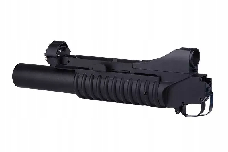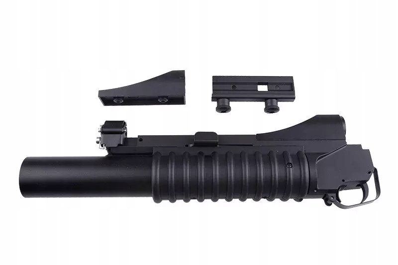 Удлиненная версия популярного гранатомета М203, сделанная в основном из металла. Страйкбольный эквивалент этого гранатомета оснащен стандартными 40-мм гранатами (не входят в комплект), стреляющими шариками с использованием газа. Важные детали, подверженные износу, изготовлены из стали. Единственный элемент из пластика — ребристая рукоятка гранатомета.