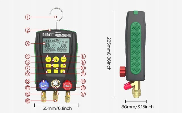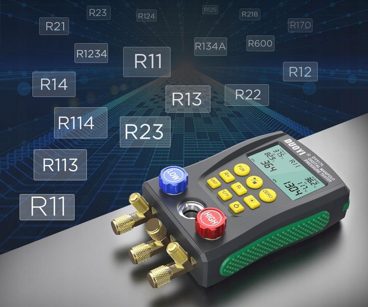 ✅ Сухое имеет : тест с двойным давлением, тест с двойным температурой, цифровое показание, преобразование давления во многих единицах, функция многих режимов и встроенная база данных о охлаждении факторов.
