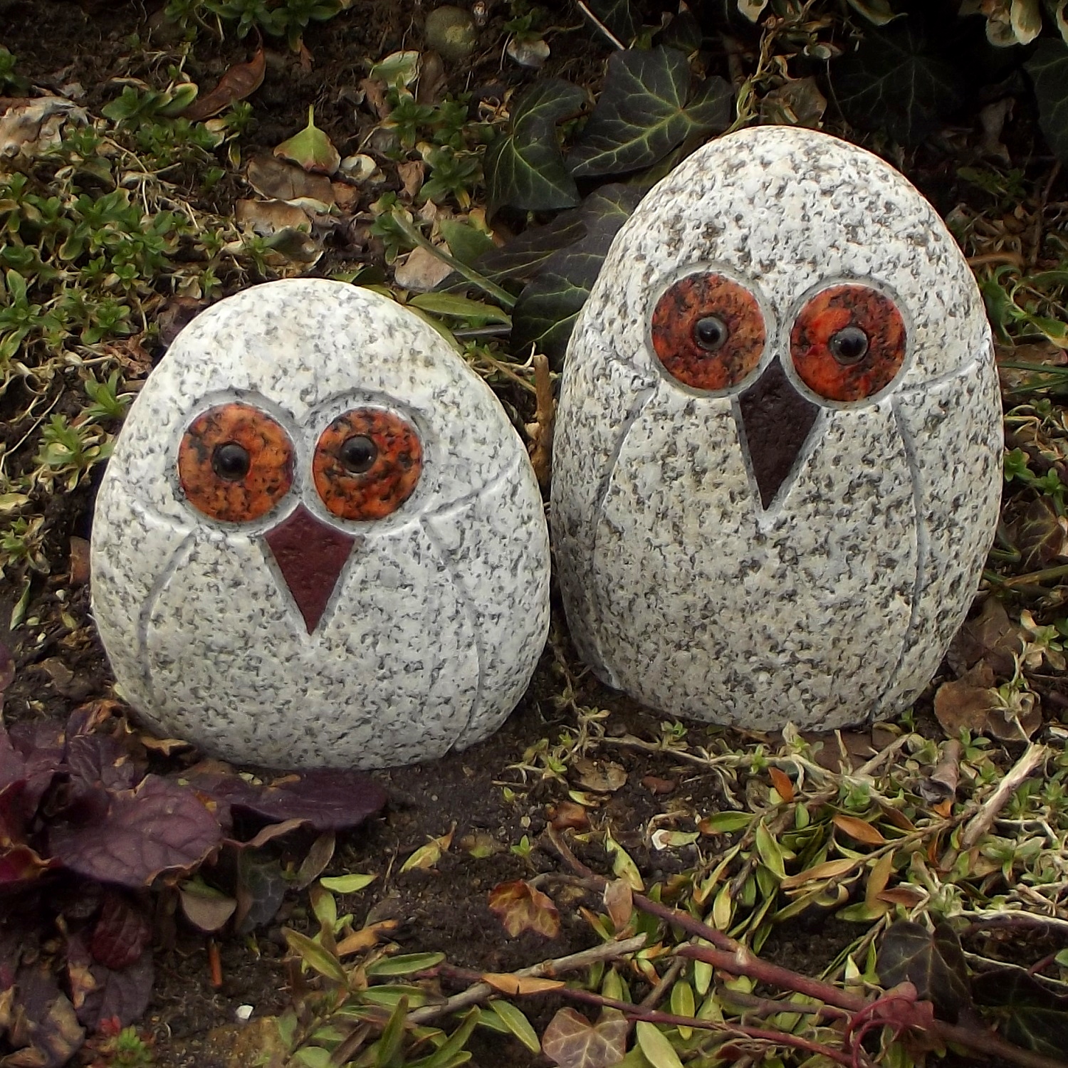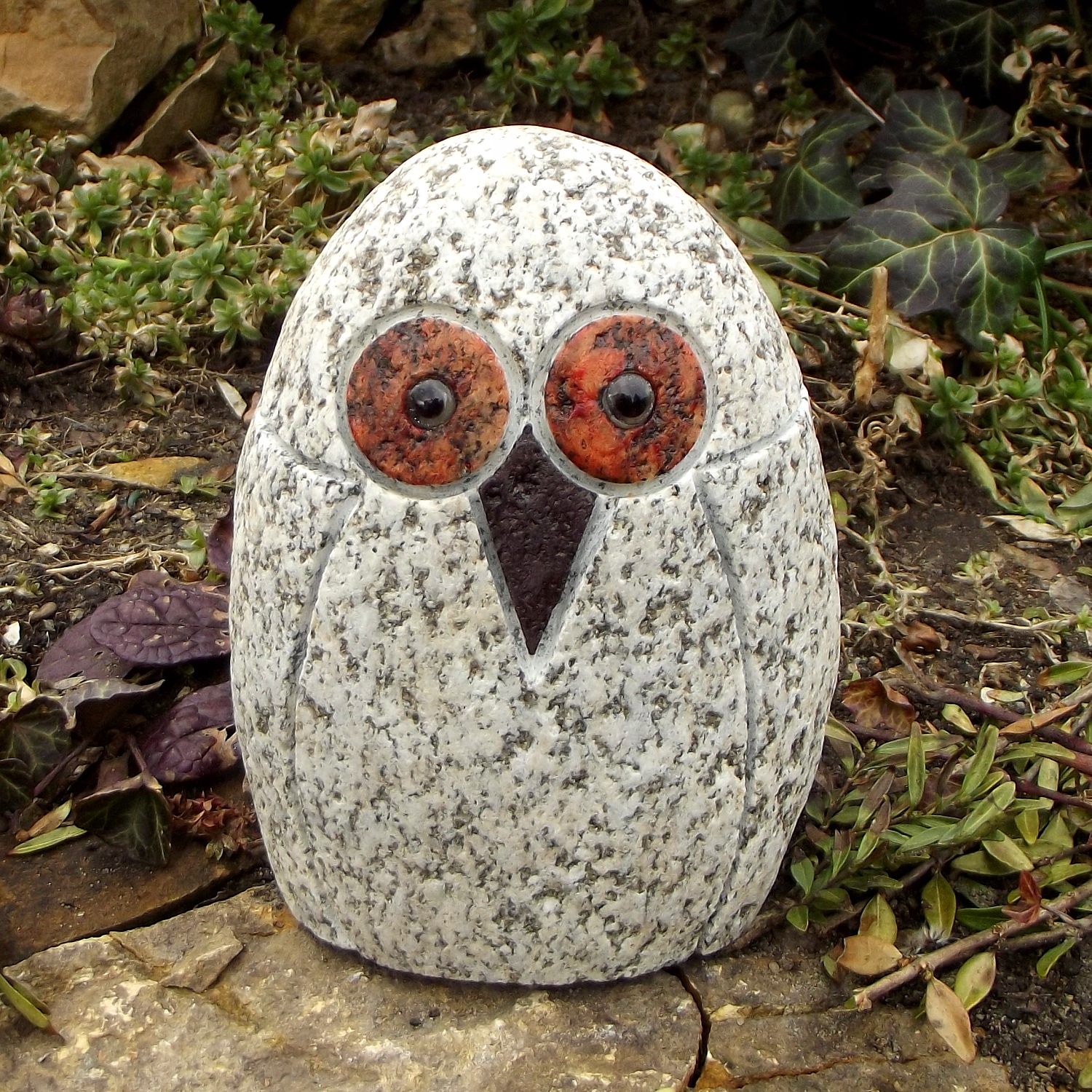 Сова из натурального камня, гранита. Фигурки прочные и устойчивые к погодным условиям, могут зимовать на улице, в саду. Камни гальки, образованные природой, делают каждую сову неповторимой и неповторимой. Совы красиво смотрятся на балках беседок, на ветвях, валунах, стенах, рокариях и т. д., высота от 7 см до 10 см, глаза у сов стеклянные. На других аукционах представлены совы большего размера и множество других оригинальных фигурок.