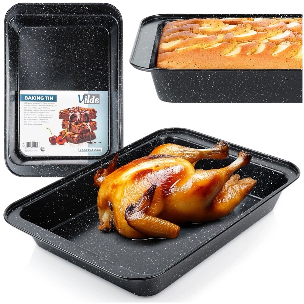 - противень - прямоугольный противень с общим размером 37,5 х 25,5 х 5 см. Внутренние размеры листа составляют 32 x 23 x 4,7 см. Он отлично подходит для выпечки мяса, овощей, пирожных или домашней пиццы на толстом дне.