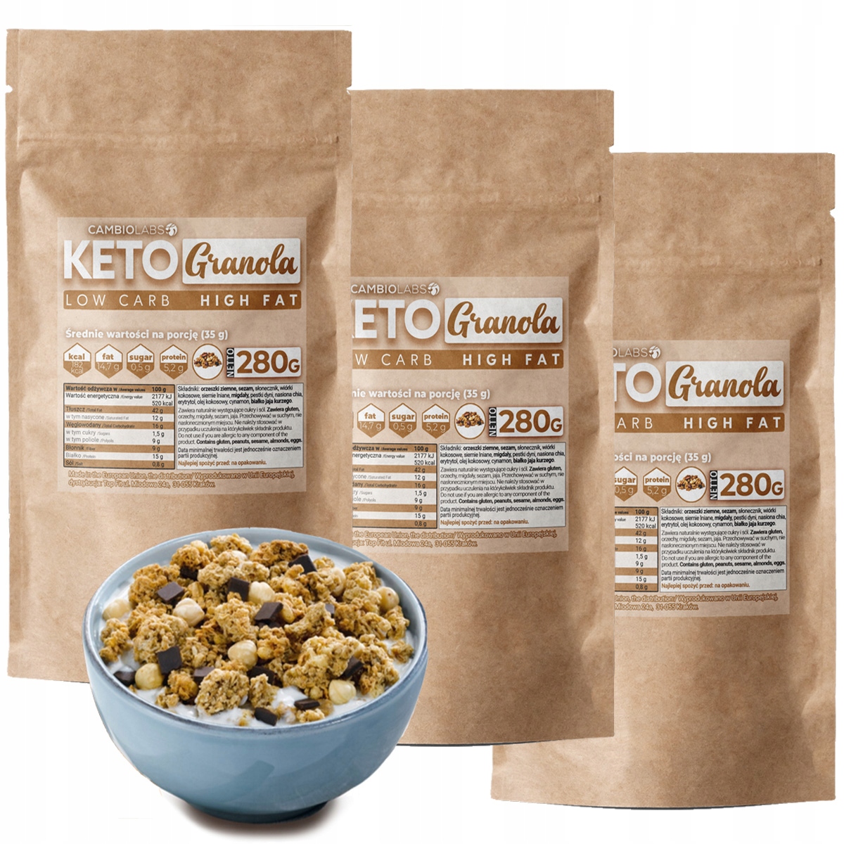Кето-гранола от Cambio Labs — идеальный способ хорошо начать день. Продукт с низким содержанием углеводов и сахара идеально подходит для всех сторонников кето-диеты, а также для диабетиков или людей, которые просто заботятся о своем питании. Гранола прекрасно сочетается с натуральным йогуртом или любым молоком, а также с другими добавками. Вы можете создать свой любимый состав для завтрака, который не только будет приятным на вкус, но и поможет поддерживать состояние кетоза. Завтрак в стиле кето еще никогда не был таким вкусным – попробуйте нашу кетогенную мюсли с ограниченным содержанием углеводов – всего 7 г на 100 г продукта.