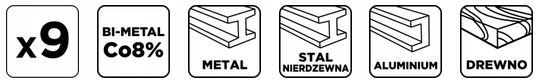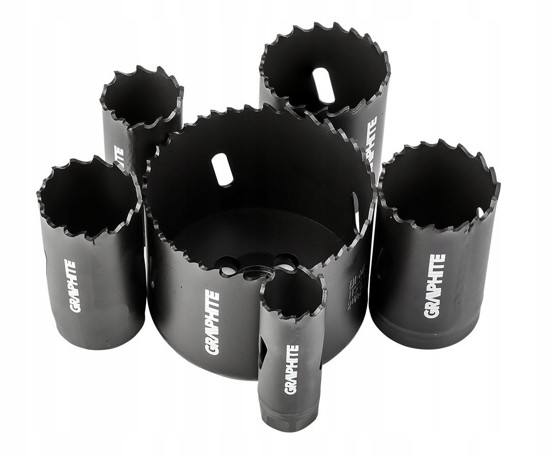 Биметаллические коронкиCo8% (19, 25, 30, 35, 40, 68 мм), набор из 9 элементов 57H921 фирмы GRAPHITE - это набор из шести биметаллических коронок Co8% диаметром: 19, 25, 30, 35, 40 и 68 мм.
