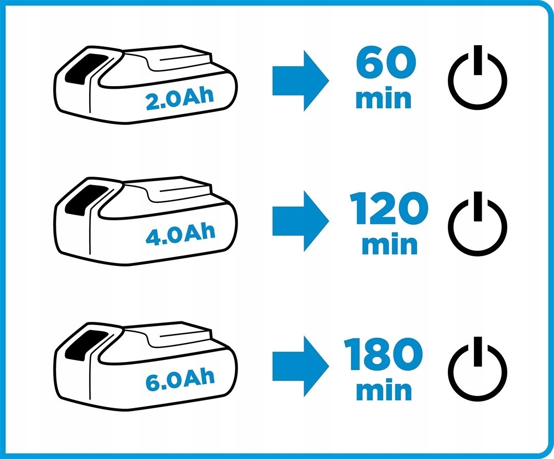 Время зарядки аккумуляторов составляет всего от 60 до 180 минут(в зависимости от их емкости):