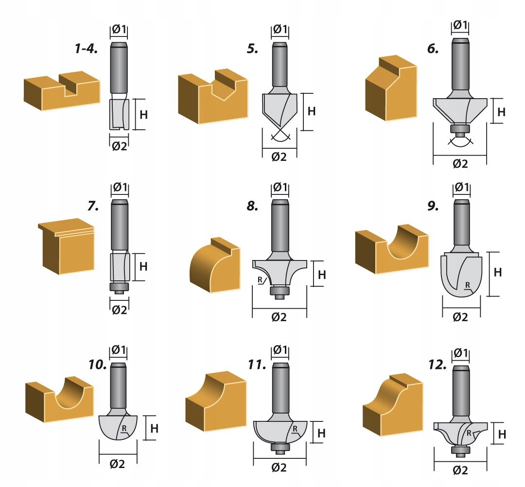 Набор фрез по дереву, 12 предметов, хвостовик 8мм