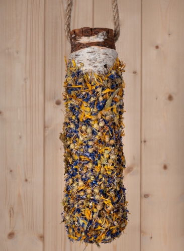 Натуральная игрушка, которую можно повесить в коробке. Он борется со скукой и в то же время приятен лошадям. Кора пня и цветочная посыпка обеспечивают полезные питательные вещества. Одним словом - вкусно и полезно.
