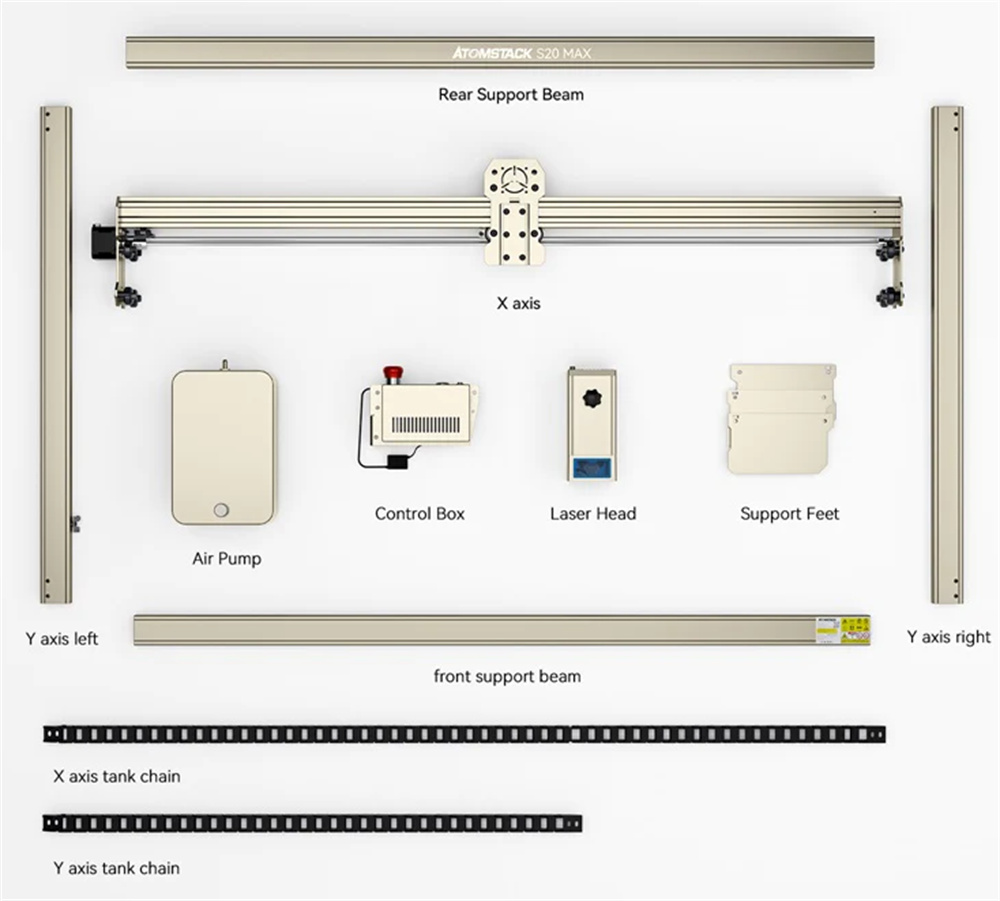 в стандартную комплектацию входит пневматический помощник, а режущие способности значительно улучшены. В то же время точность и качество резки можно значительно оптимизировать, что делает Atom Stack S20 Max настоящим крупноформатным станком для лазерной резки.