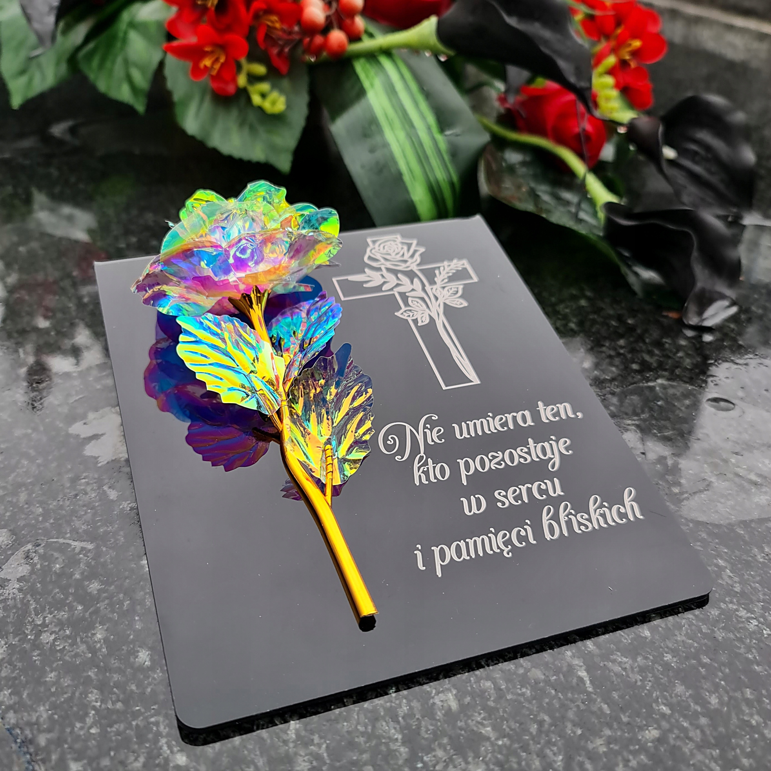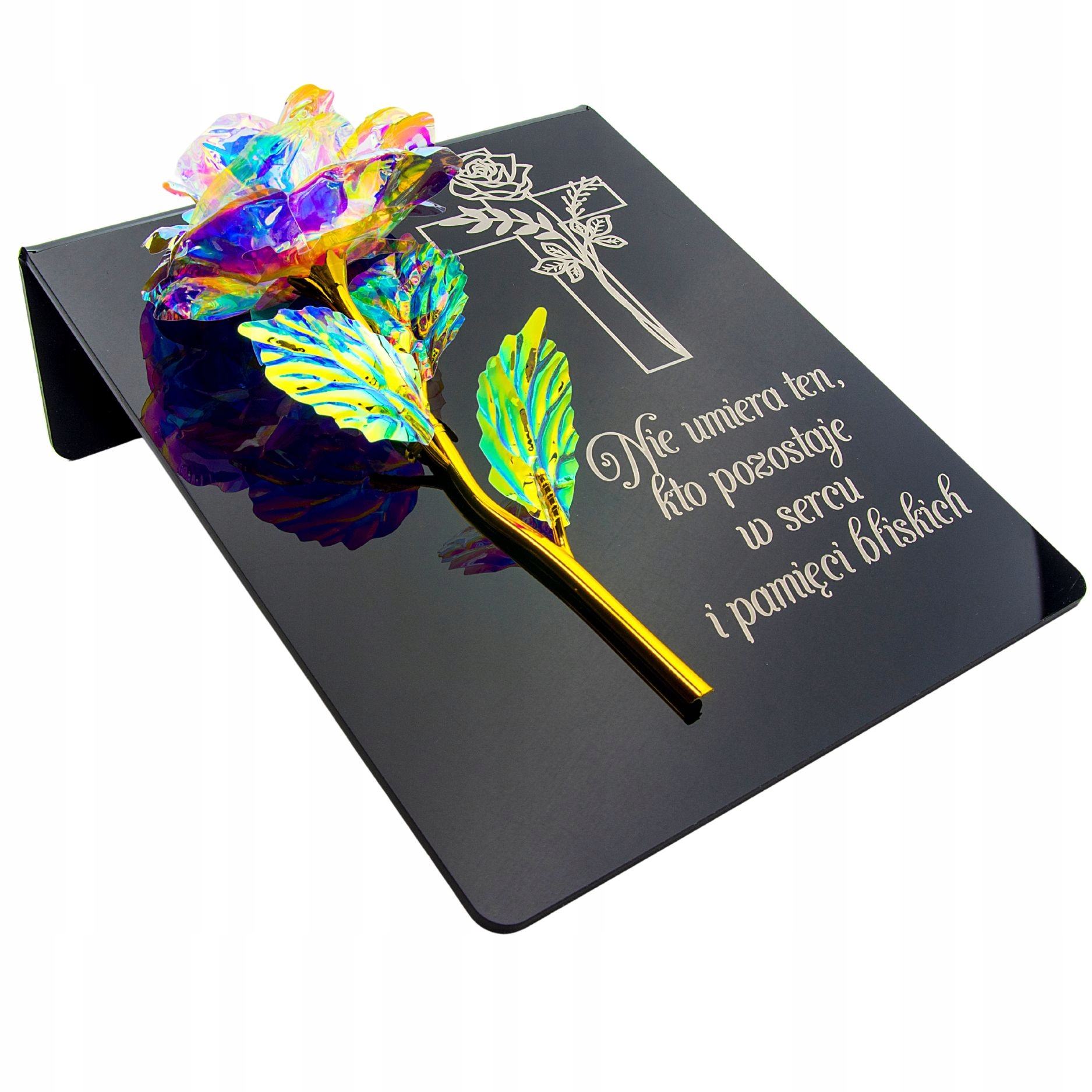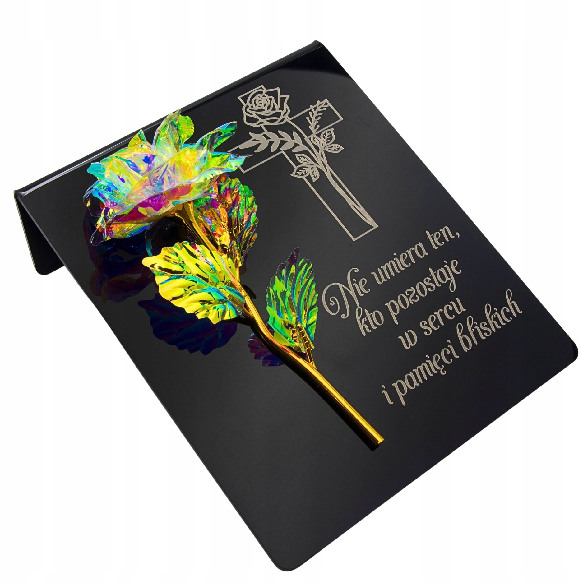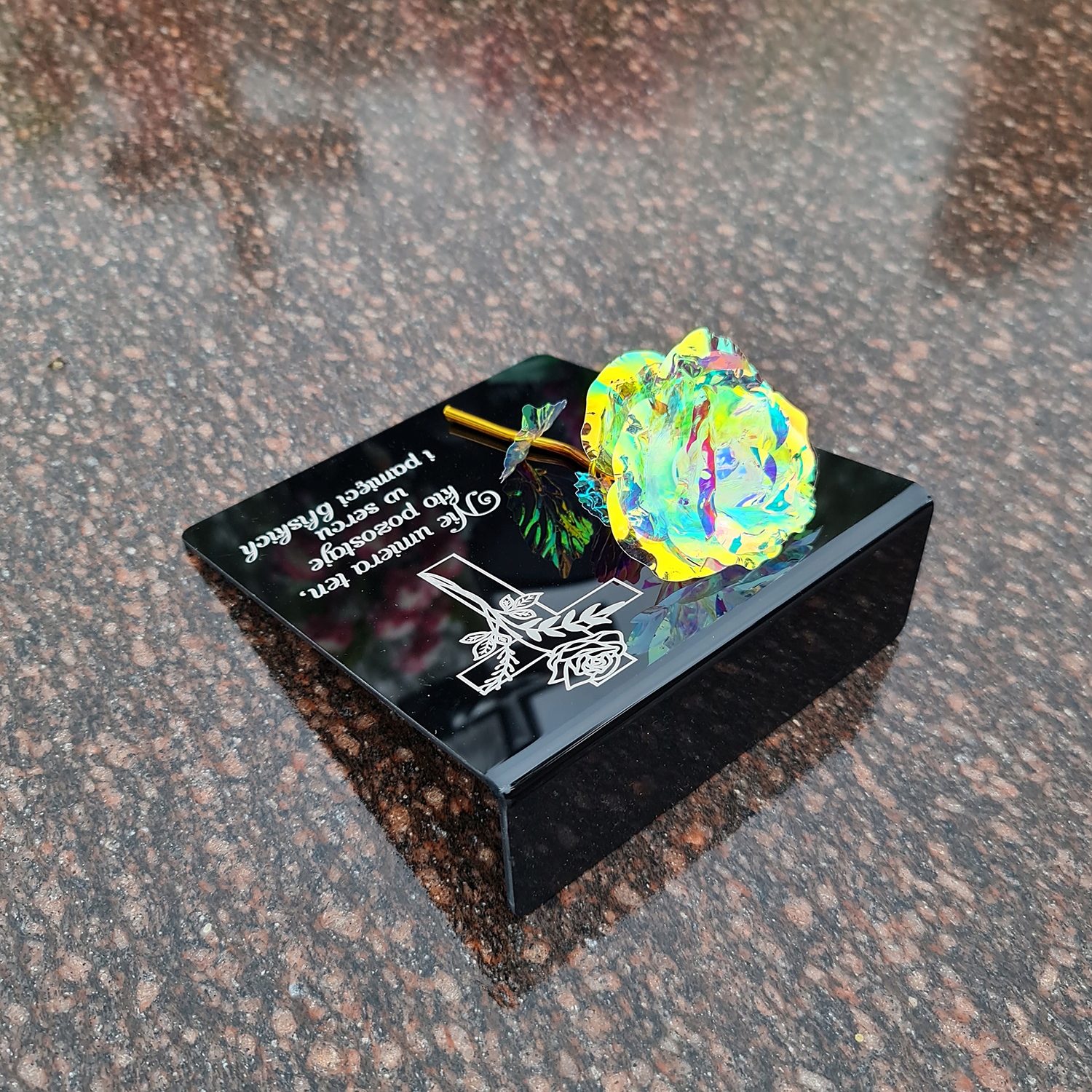 радужная золотая роза на пьедестале с гравировкой