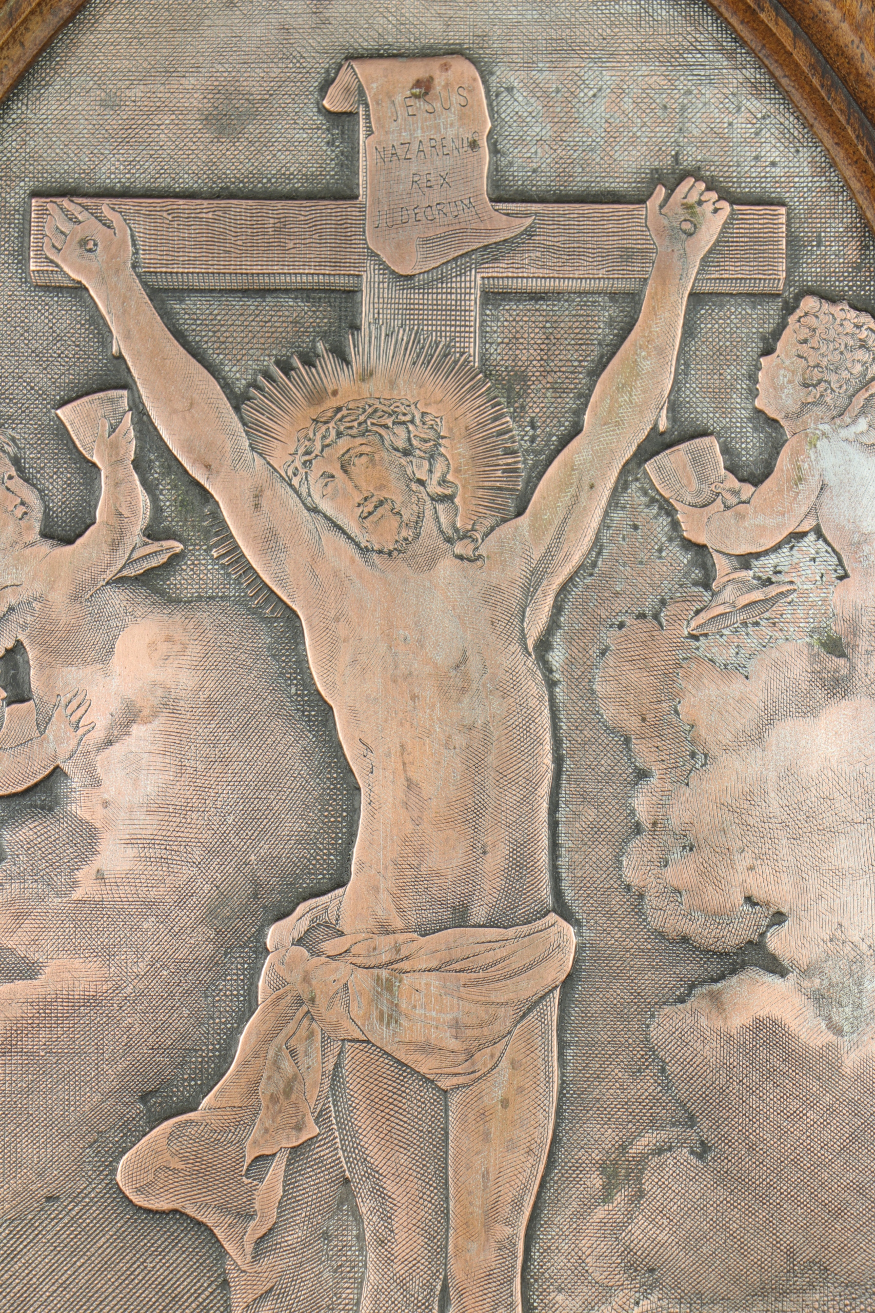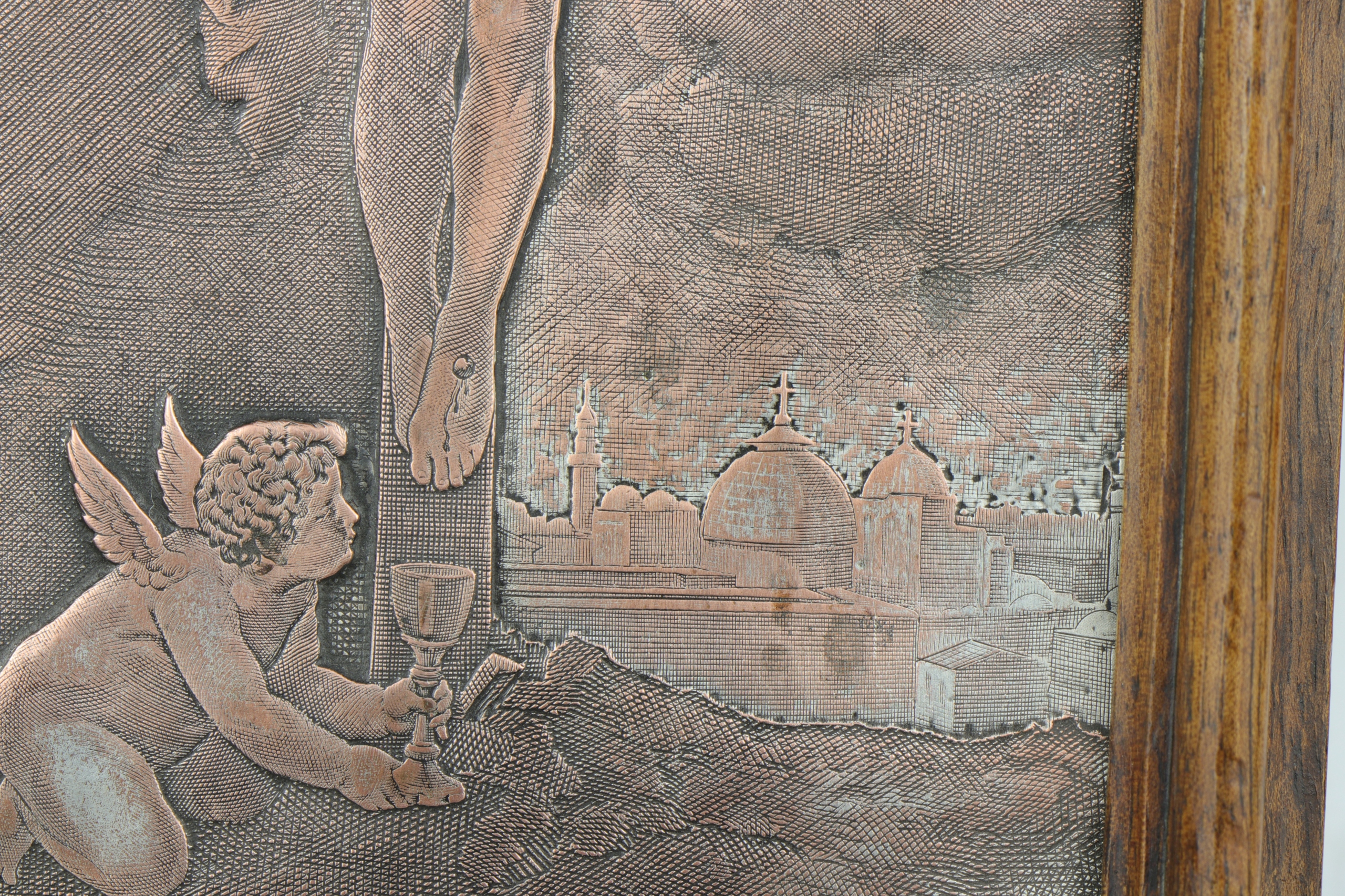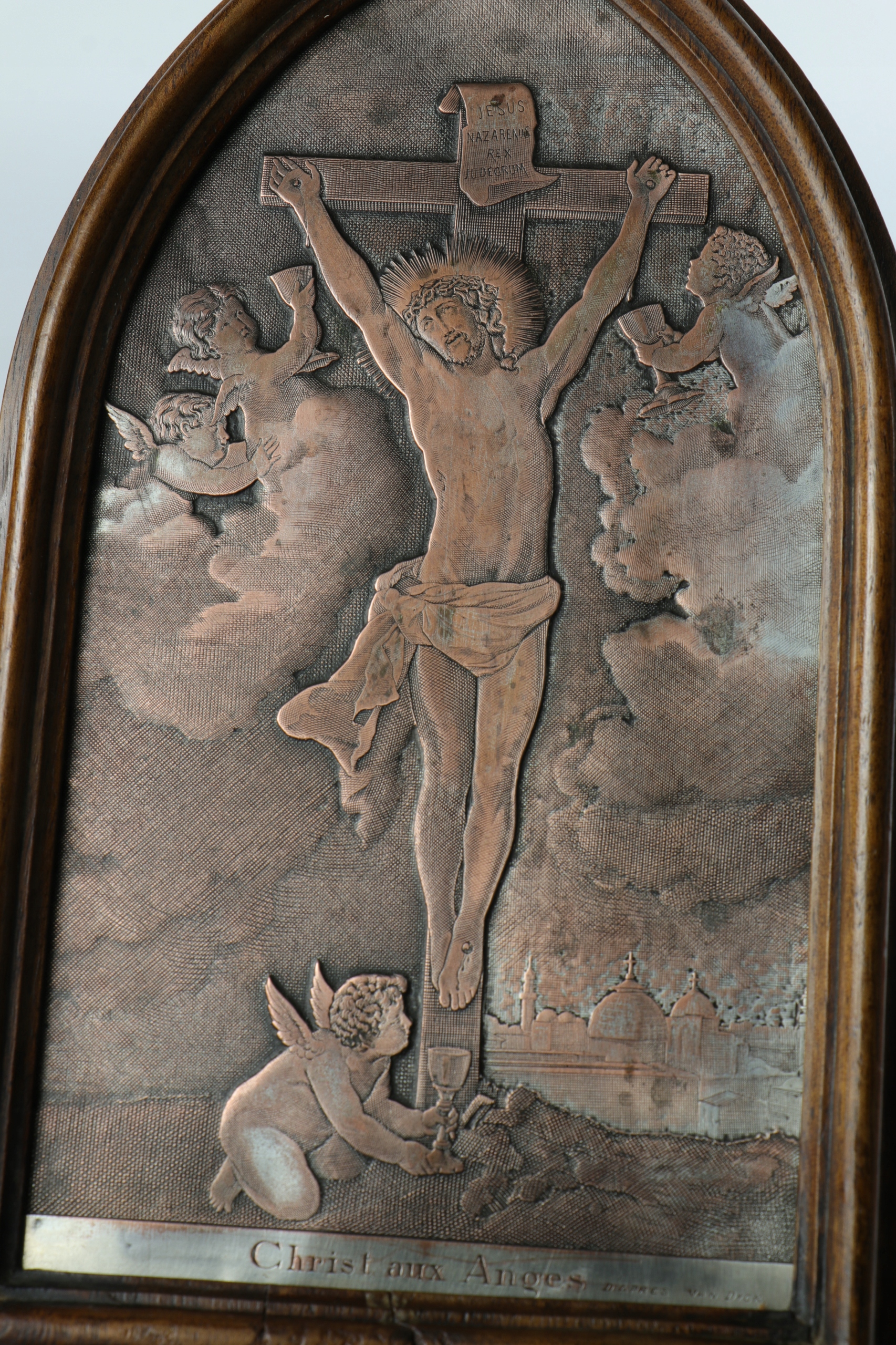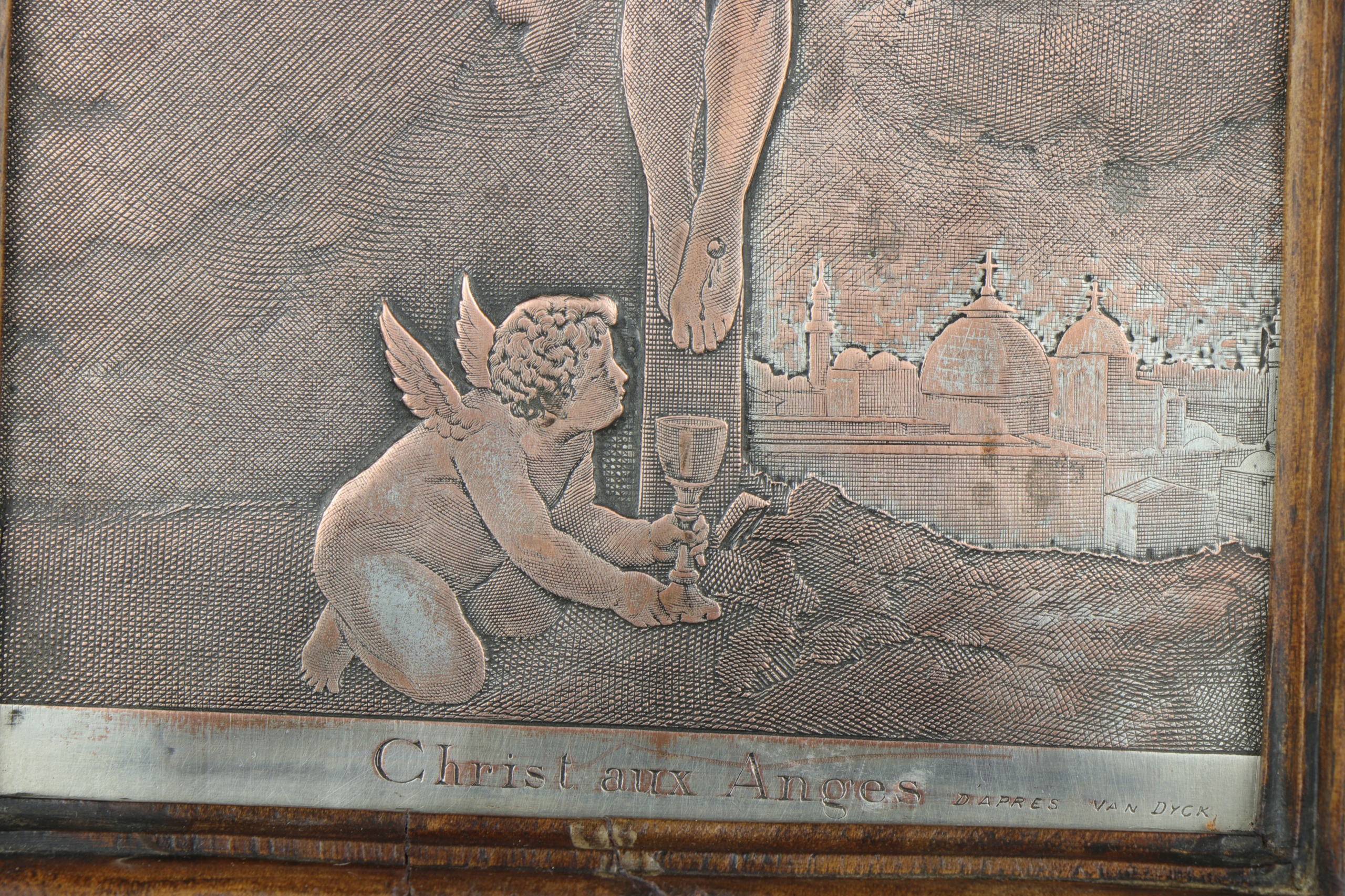Гравированная серебряная доска по мотивам картины Ван Дейка. Мемориальная доска внизу с надписью Christ aux Anges d'apres Van Dyck. Красивая, очень детальная гравюра на посеребренной медной пластине, изображающая ангелов, собирающих кровь Иисуса, а в правом нижнем углу - стены Иерусалима. Мемориальная доска оформлена в деревянную раму в готическом стиле. Мемориальная доска, которую можно разместить на столе и повесить на стену.