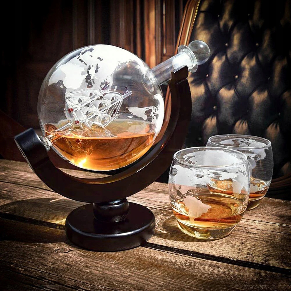 Графин в форме глобуса с выгравированной картой мира, внутри графина изображен затонувший корабль.