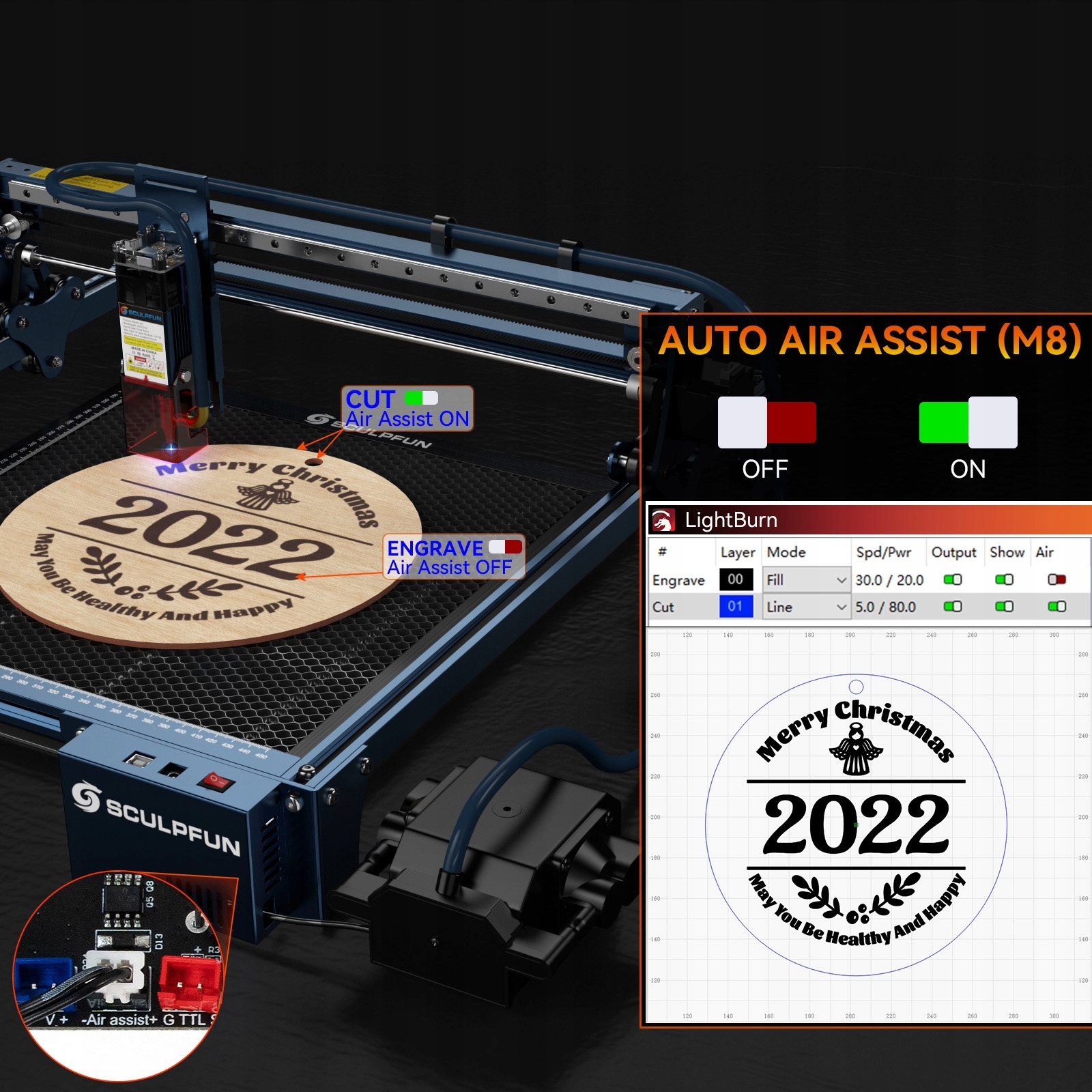 1. Автоматически управляемая система подачи воздуха: Традиционный адаптер подачи воздуха всегда будет включен, и им нельзя будет управлять во время гравировки, а выгравированный рисунок превратится в размытый туман. Серия S30 оснащена 32-битной материнской платой Airassist и воздушным насосом управляющего типа, который может интеллектуально управлять переключателем подачи воздуха во время гравировки с помощью кнопки M8 программного обеспечения LightBurn, что делает гравировку и резку очень чистыми и идеальными для изготовления изысканных подарков
