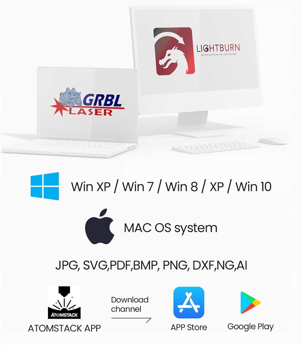 Может быть совместим со стандартными спецификациями программного обеспечения для гравировки, включая LaserGRBL, LightBurn, поддержка Win XP/Win 7/Win 8/XP/Win 10, поддержка системы MAC (LightBurn), поддержка формата гравировки NC, BMP, JPG, PNG, DXF и так далее.