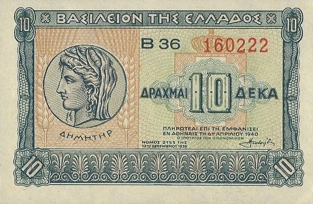 Grecja - 10 Drachmai - 1940 - P314 - St.1