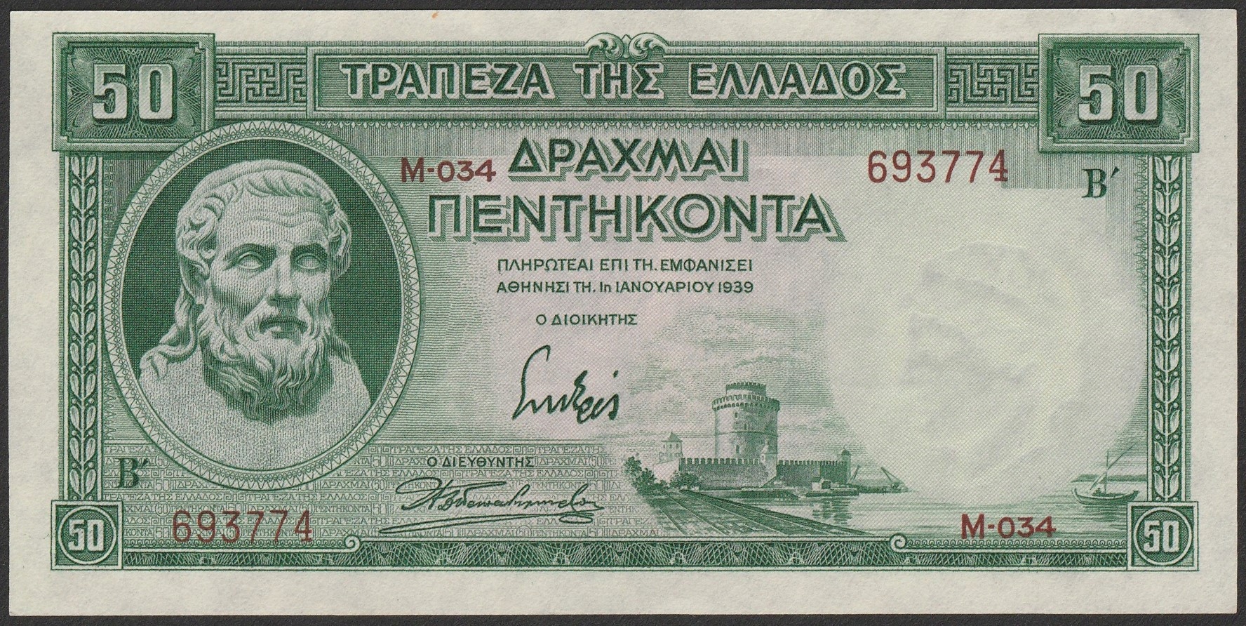 Grecja 50 drachm 1939 - M-034 - stan bankowy UNC -