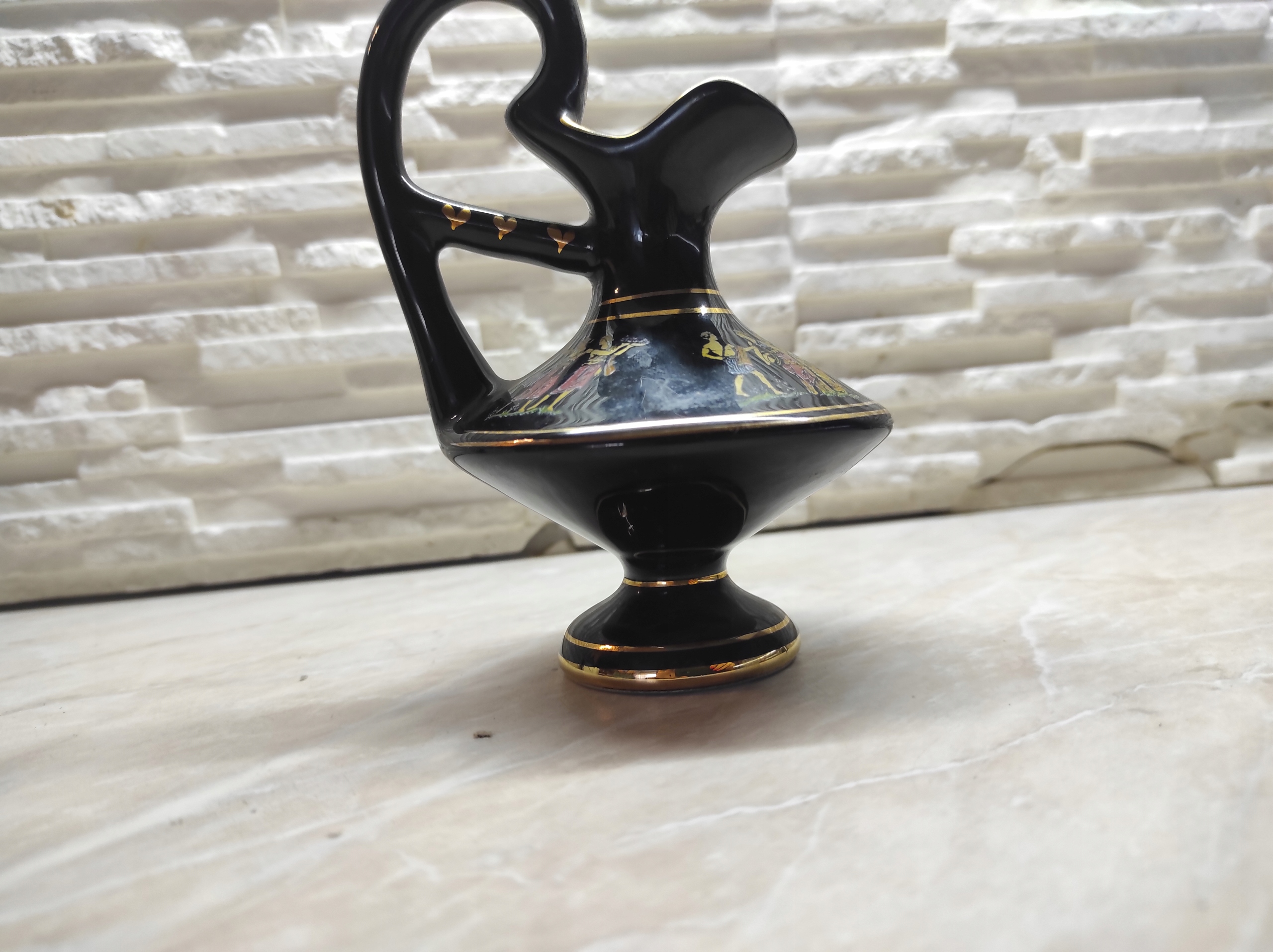 Небольшой черно-золотой винтажный кувшин с древнегреческим узором. Изготовлено компанией Neofitou Keramik в Греции из черной глазурованной керамики с узором из 24-каратного золота. Примерно 1960 г.