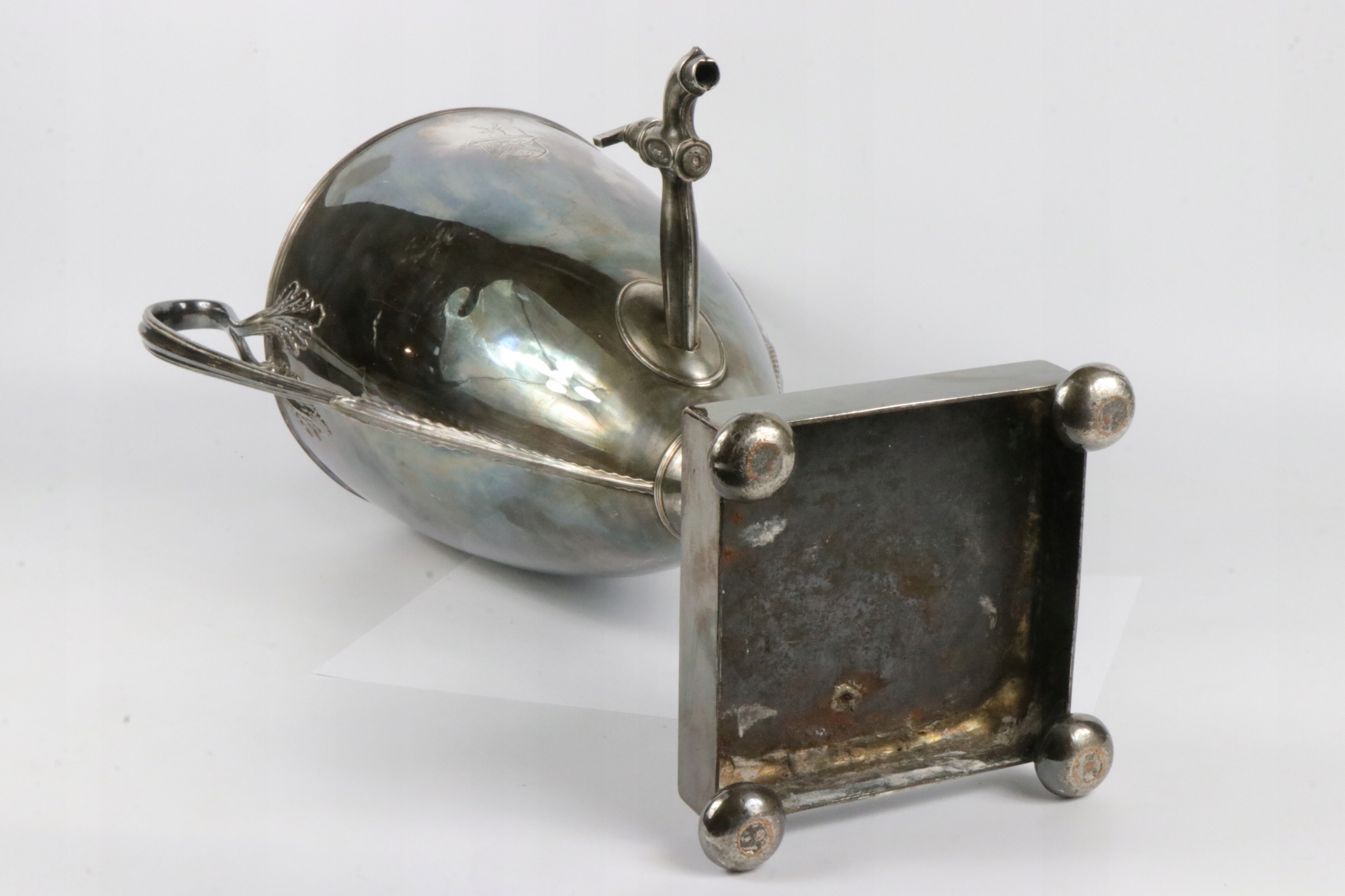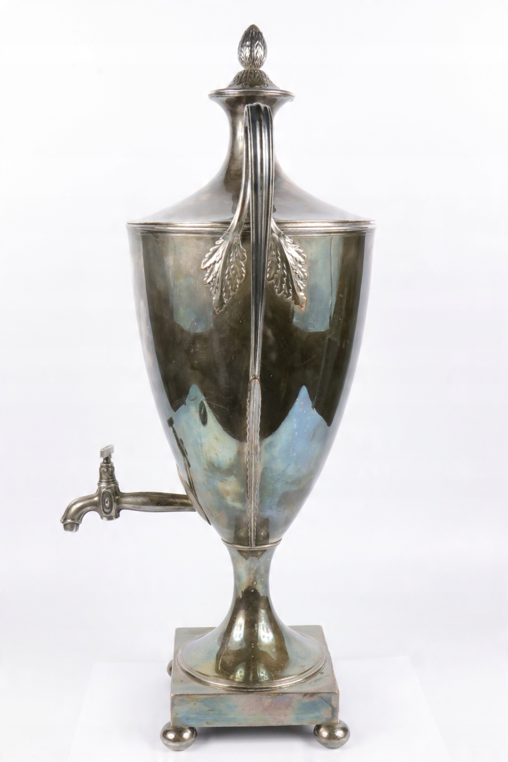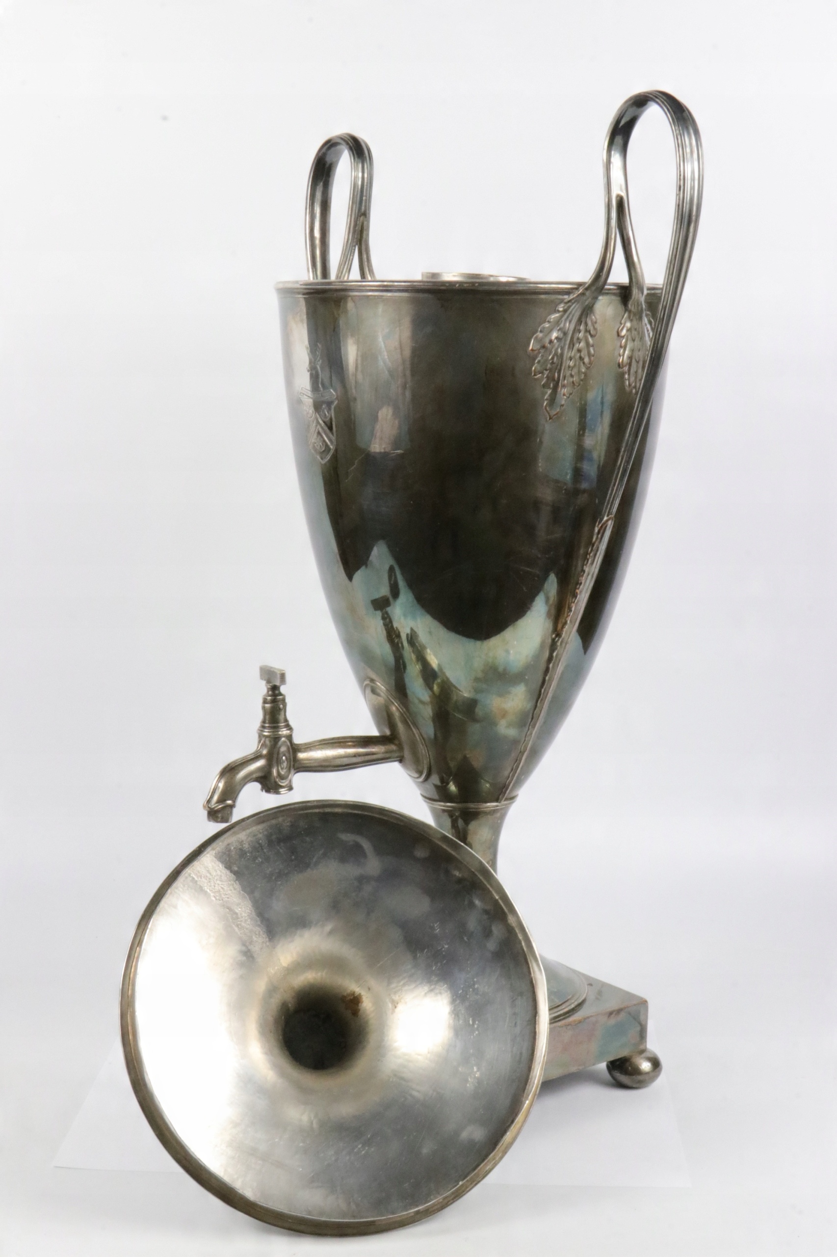 Посеребренный латунный самовар для горячей воды. Предмет начала XIX века в стиле ампир, греческая урна. Ваза, украшенная эрбием, от английской семьи Фостеров, генеалогическое древо которой восходит к 14 веку. Надпись «DIUINI GLORIA RUIS» на гербе Возможно, герб Джона Фостера, 1-го барона Ориэла, жившего в 1740-1828 гг. Очень интересный коллекционный антиквар.
