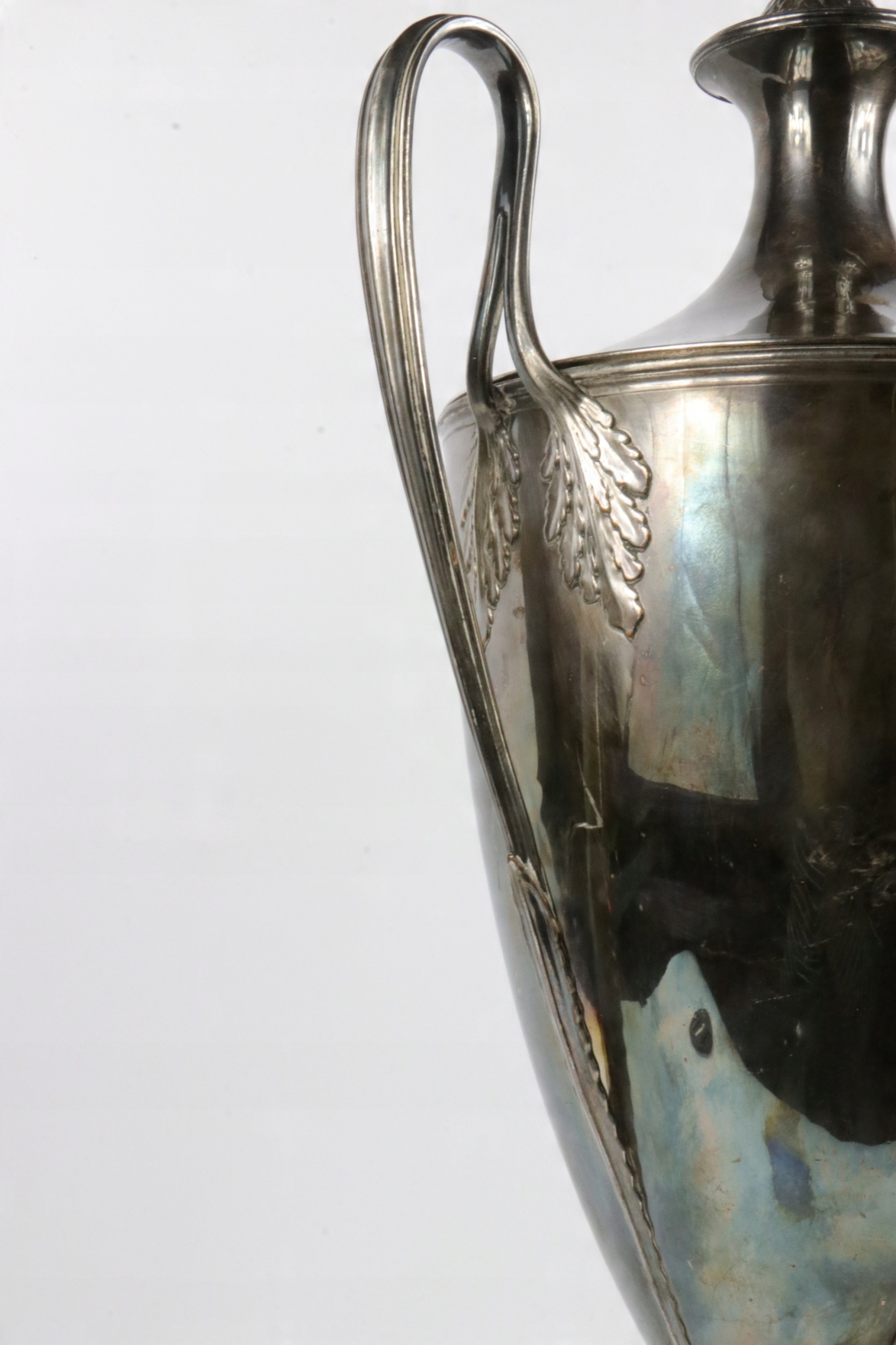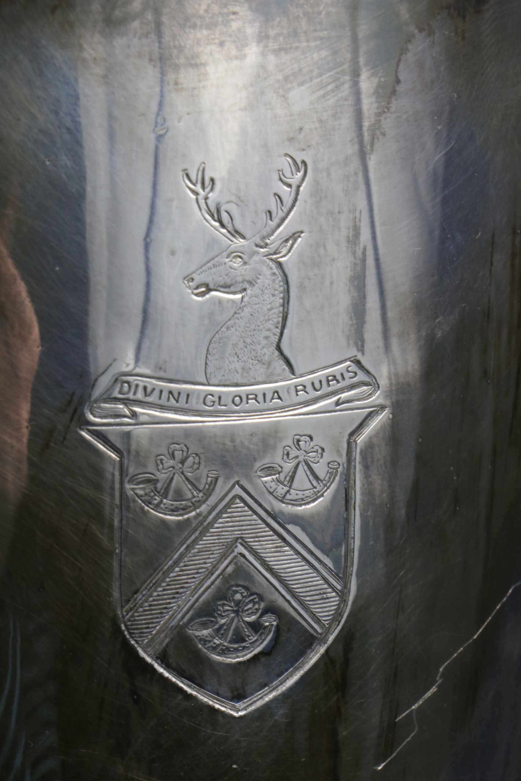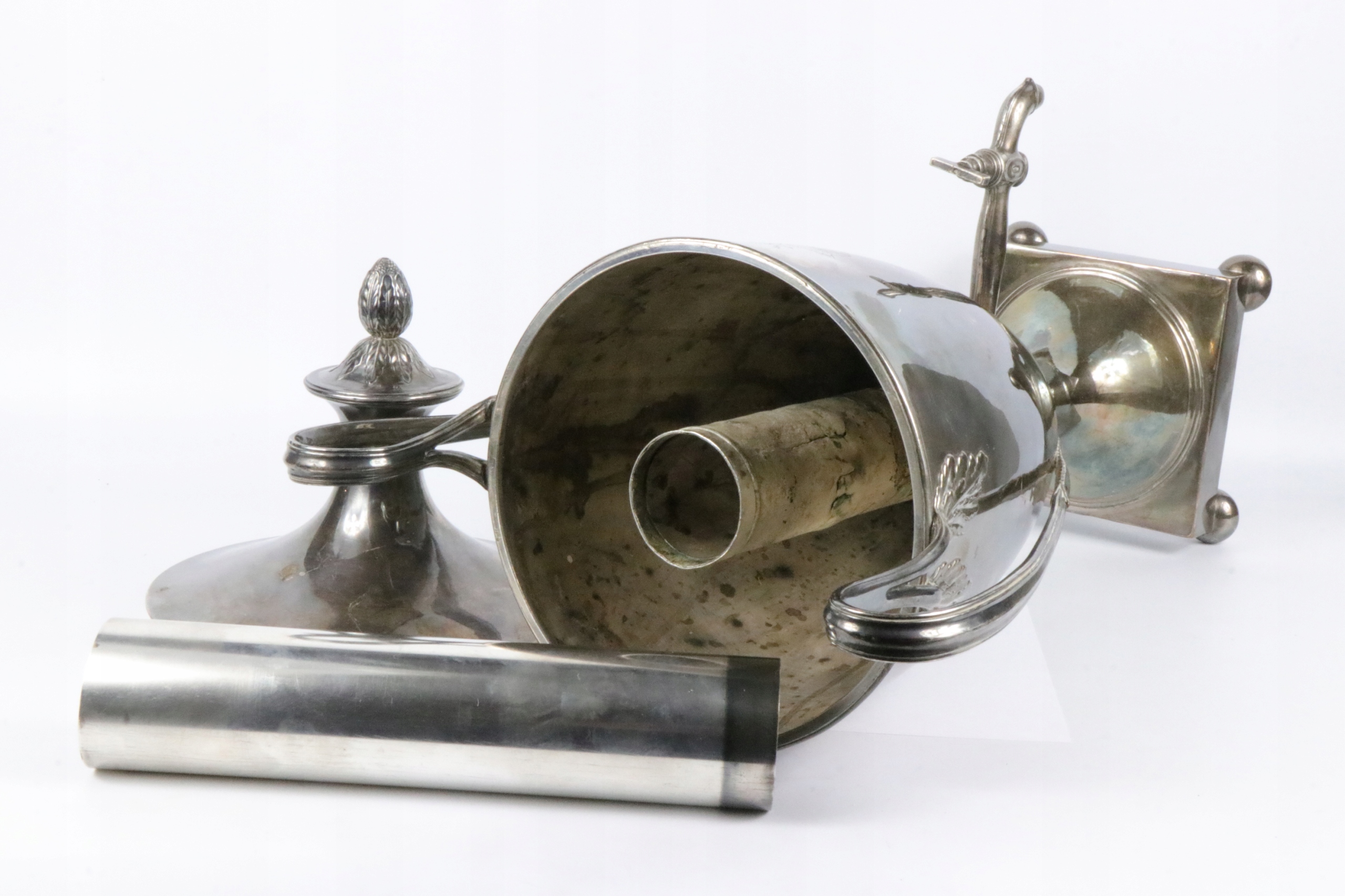 Посеребренный латунный самовар для горячей воды. Предмет начала XIX века в стиле ампир, греческая урна. Ваза, украшенная эрбием, от английской семьи Фостеров, генеалогическое древо которой восходит к 14 веку. Надпись «DIUINI GLORIA RUIS» на гербе Возможно, герб Джона Фостера, 1-го барона Ориэла, жившего в 1740-1828 гг. Очень интересный коллекционный антиквар.