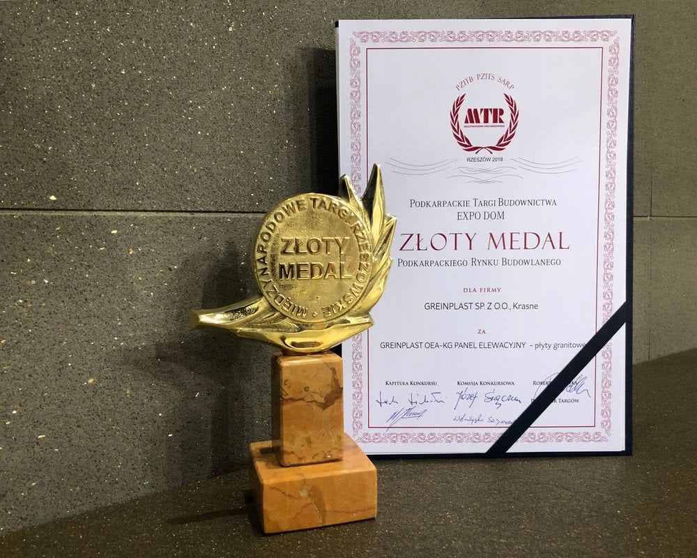 Золотая медаль компании GREINPLAST за продукцию гранитные (кварцевые) плиты получена на выставке Expo Dom Construction в 2018 году.
