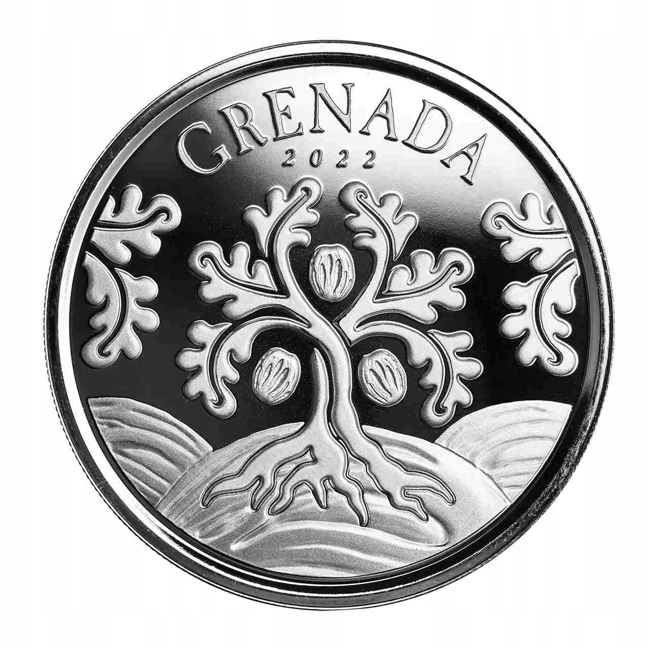 Мускатное дерево Гренады — это серебряное изделие весом в одну унцию, отчеканенное из серебра высочайшего качества. Изготовлено и распространено Монетным двором Скоттсдейла по поручению Центрального банка Восточного Карибского бассейна.